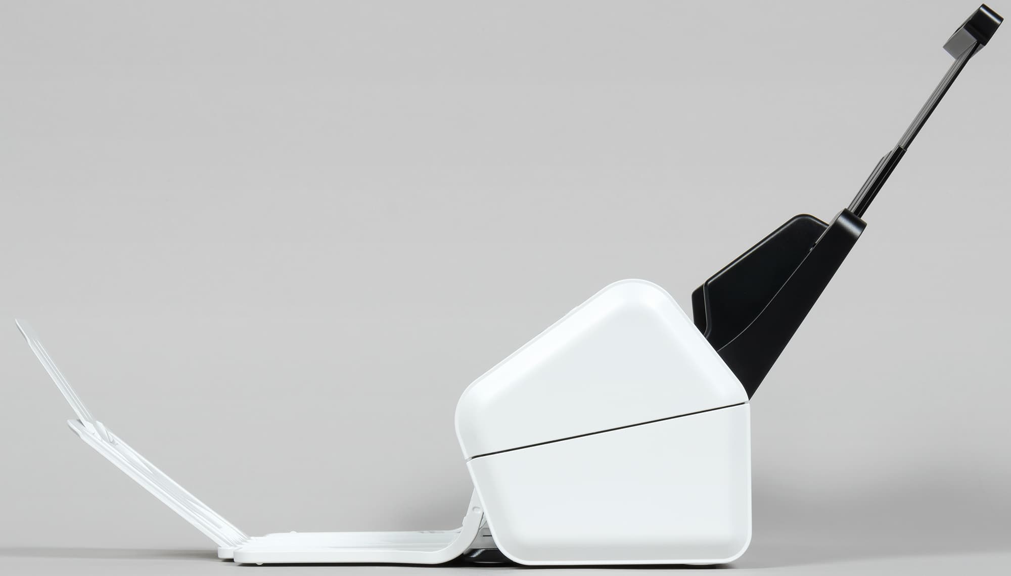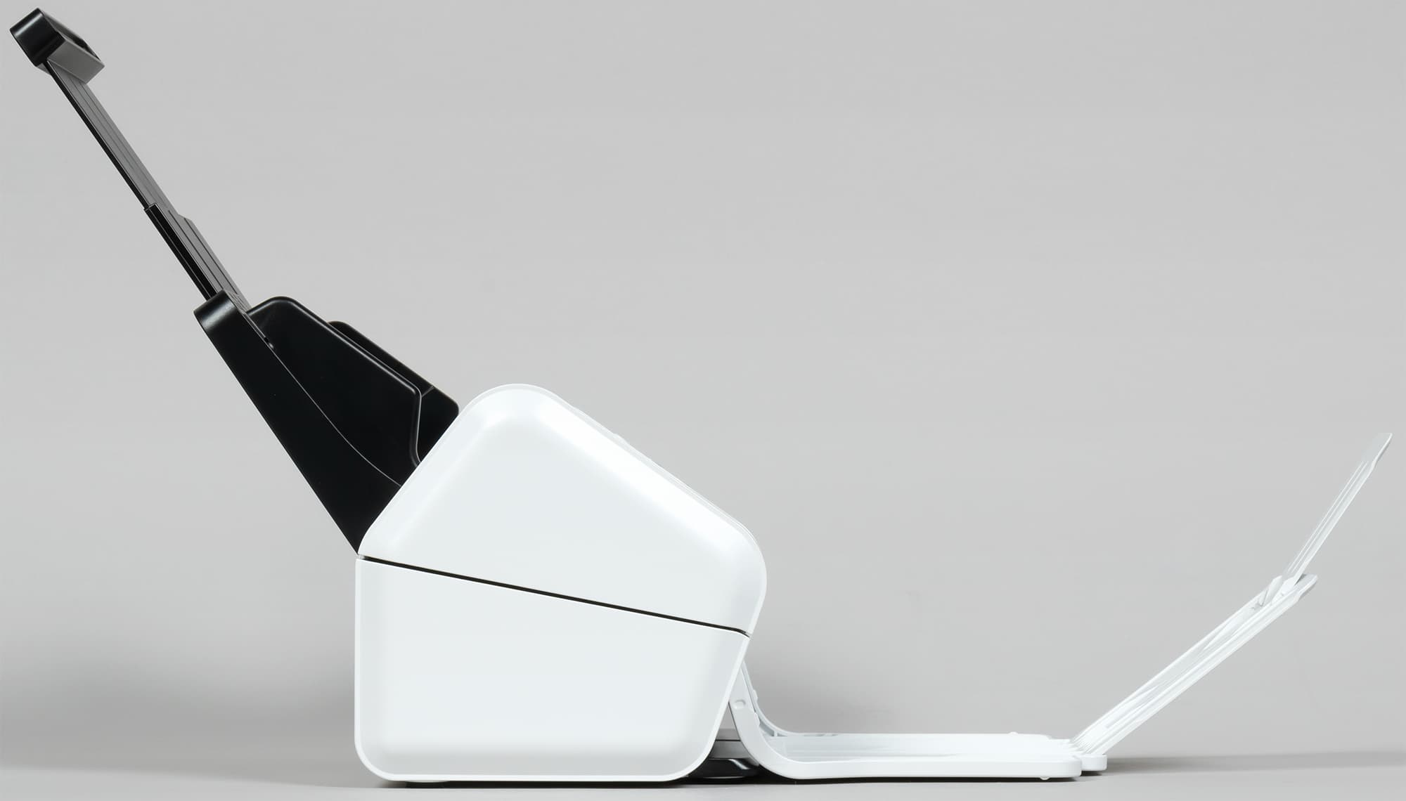 Слева в верхней части корпуса имеется рычажок, нажатие на который позволяет откинуть фронтальную часть сканера, после чего открывается доступ к сканирующим линейкам, подающим роликам и другим компонентам. Это нужно для периодического обслуживания: после прохождения через сканер многих тысяч документов внутри неизбежно будет накапливаться бумажная пыль, ухудшающая качество сканирования, да и поверхности роликов будут загрязняться, что может вызвать сбои в подаче.