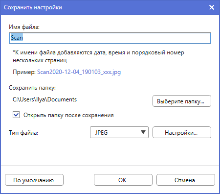Закончив выбор параметров сканирования, нажимаем «Сохранить настройки» и попадаем в окно с теми самыми параметрами сохранения сканов в файл, то есть и здесь название выбрано неудачно.
