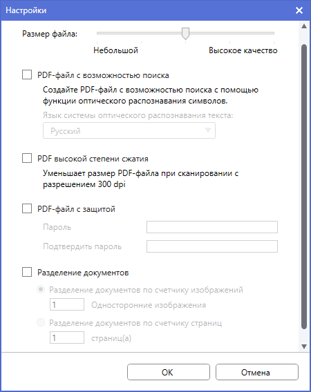 Здесь присутствует и выбор папки, а список форматов уже не ограничивается PDF и JPEG — добавляются BMP, PNG, TIFF и даже текстовые TXT, RTF, подразумевающие необходимость использования программы распознавания символов OCR. Для многих форматов есть и дополнительные параметры — например, размер файла (или степень сжатия) для JPEG, язык распознавания для TXT и RTF, а для PDF целый набор, включая возможность текстового поиска, что тоже требует распознавания: