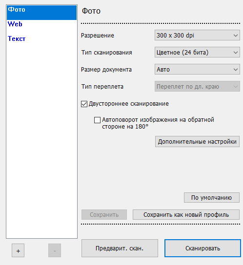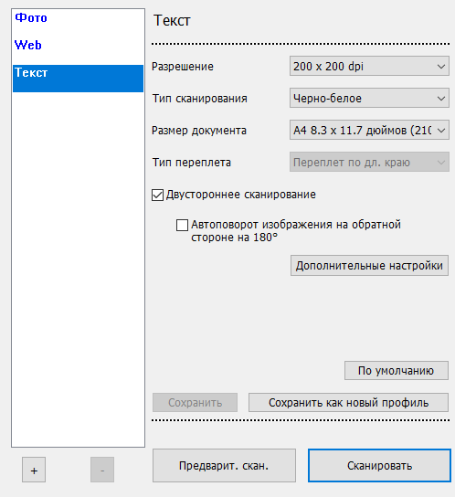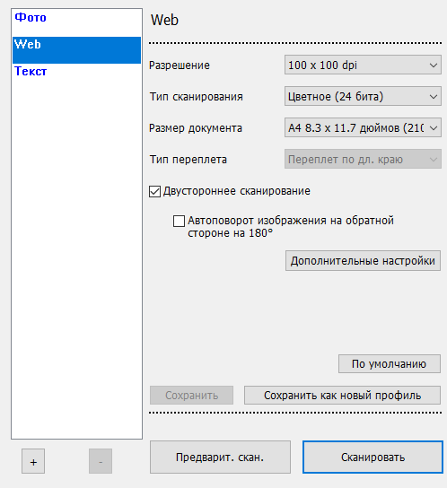 У TWAIN те же основные настройки плюс включение обработки обеих сторон документа скомпонованы в три предустановленных профиля, но можно создавать и собственные.