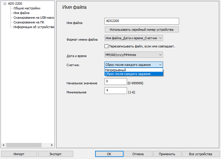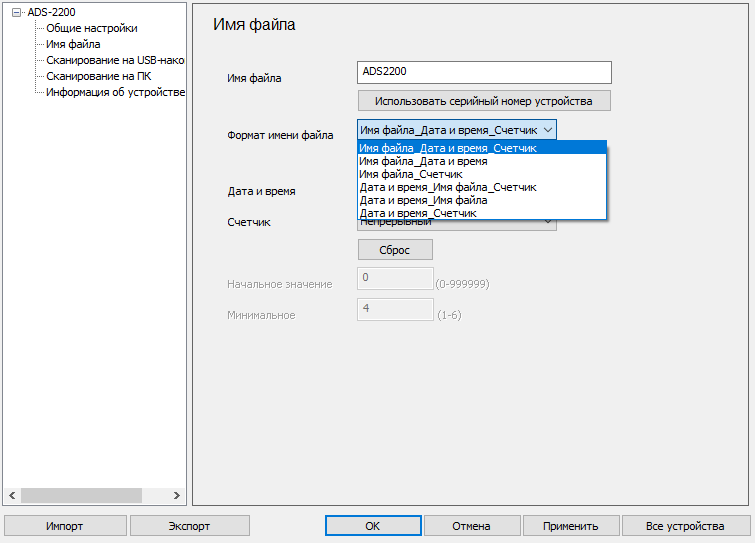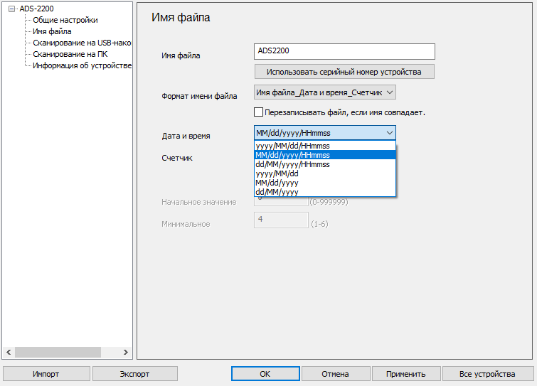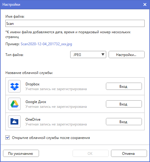 «Имя файла»: именование файлов при сохранении сканов.