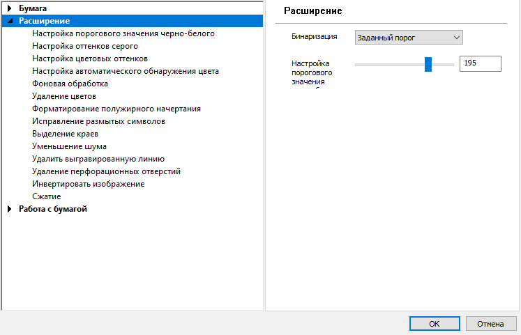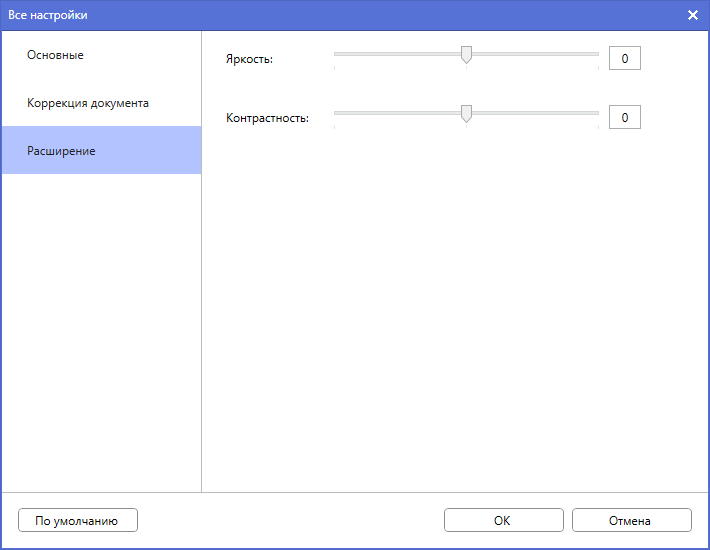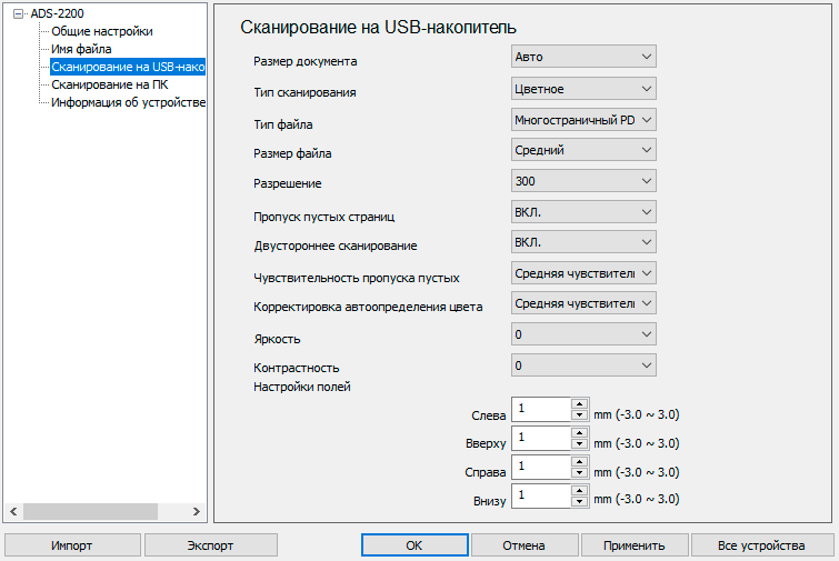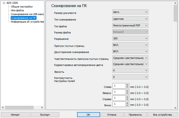 Как видите, список вполне внушительный, в нем присутствуют не только все основные установки вроде режима цветности, разрешения, формата сохранения, но и кое-что сверх того — настройка полей в пределах плюс-минус 3 миллиметра, корректировка яркости и контрастности.