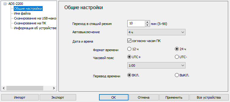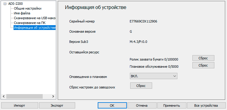 Настройки сканирования мы рассмотрим ниже, а пока остановимся на последней закладке «Информация об устройстве».