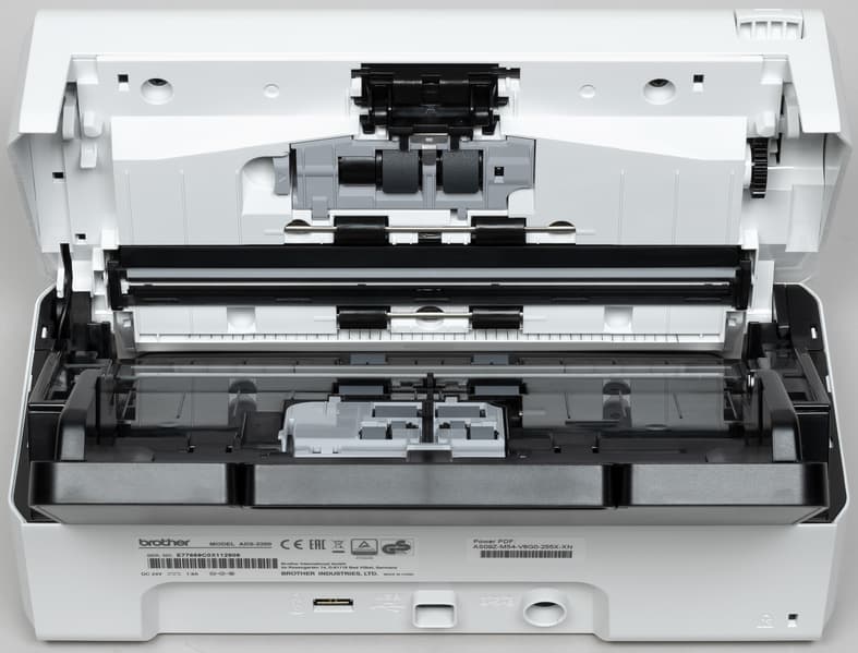 Здесь нет установок, связанных с обнаружением подачи сразу нескольких листов, но в настройках драйвера TWAIN можно включить эту функцию. В описаниях старших моделей настольных документ-сканеров Brother упоминается ультразвуковой датчик мультиподачи, а здесь про него нет ни слова, внутри аппарата датчика тоже не видно, и остается гадать: есть он вообще или для снижения цены разработчики решили обойтись иным, менее затратным (но и менее эффективным) способом регистрации захвата более чем одного листа. В любом случае вряд ли можно однозначно оценивать это в категориях «хорошо — плохо», потому что у потребителя есть выбор: заплатить побольше и купить модель с расширенным набором функций либо сэкономить, но обойтись без чего-то полезного.
