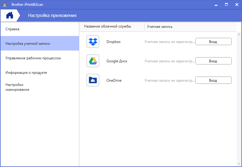 Символом шестеренки слева в верху вызываем список настроек. Здесь, помимо справочной и чисто служебной информации (вроде отправлять или не отправлять в компанию Brother сведения об использовании приложения), есть параметры взаимодействия с облачными сервисами, но настройки самого сканирования не являются доступными.
