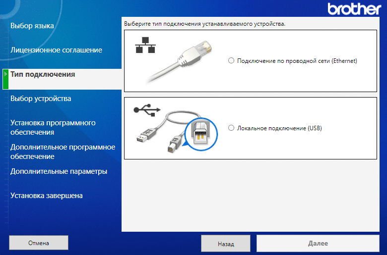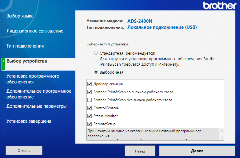 Затем следует запрос состава устанавливаемого ПО — пока речь идет о драйверах, а также служебных программах и утилитах Brother.