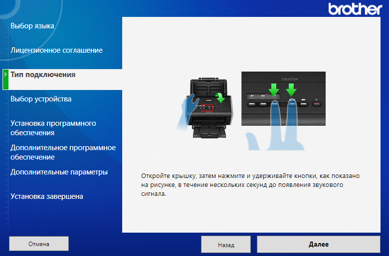 Если нужно взаимодействовать со сканером с какого-то сетевого компьютера, нужно запустить на нем установку ПО сканера, на соответствующем этапе выбрать тип подключения к сети и следовать инструкциям. Одна из них требует открыть крышку сканера, нажать две кнопки и удерживать их до появления звукового сигнала: