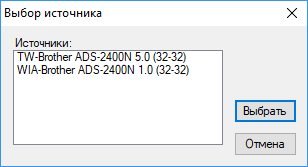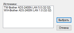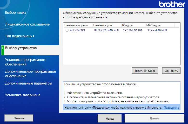 На этапе выбора устройства осуществляется поиск в сети с выдачей списка найденных сканеров Brother, выбираем нужный.