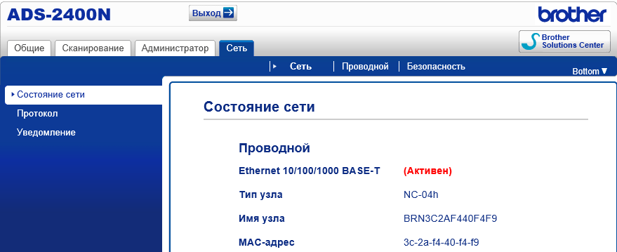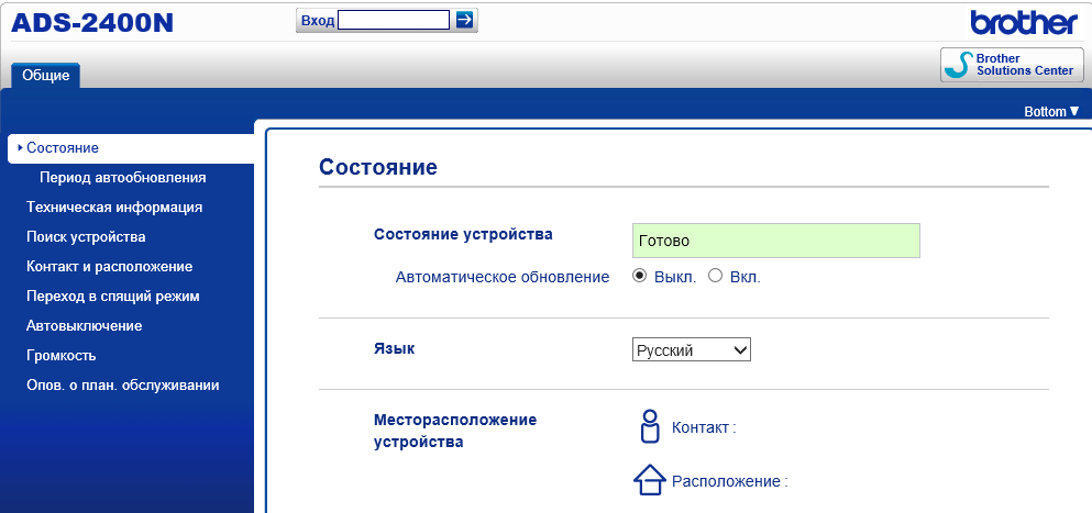 После этих процедур сканер уже может работать в сети, причем доступно как сканирование с отправкой на сетевые ресурсы (об этом ниже), так и управление сканером через веб-интерфейс. Набираем в адресной строке браузера IP-адрес устройства и получаем такое окно: