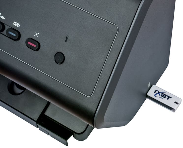Еще один разъем USB 2.0 находится на правой боковой стенке, он предназначен для подключения съемных запоминающих устройств с целью сохранения на них отсканированных документов без использования компьютера. В качестве возможных устройств упомянуты «стандартные USB-накопители до 64 ГБ» с файловой системой FAT (FAT12/16/32 и exFAT) — очевидно, имеются в виду флешки, а о других видах носителей вроде SSD/HDD с соответствующим интерфейсом или SD-карт через картовод не говорится.