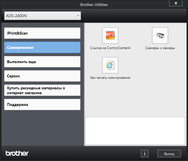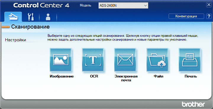 Из окна Brother Utilities можно задействовать приложение ControlCenter4, которое может запускаться по требованию или, как Status Monitor, включаться в автозагрузку. Оно позволит работать с документами без какого-либо дополнительного ПО, а также осуществлять настройки сканера через вызов только что упомянутой программы Brother ADS.