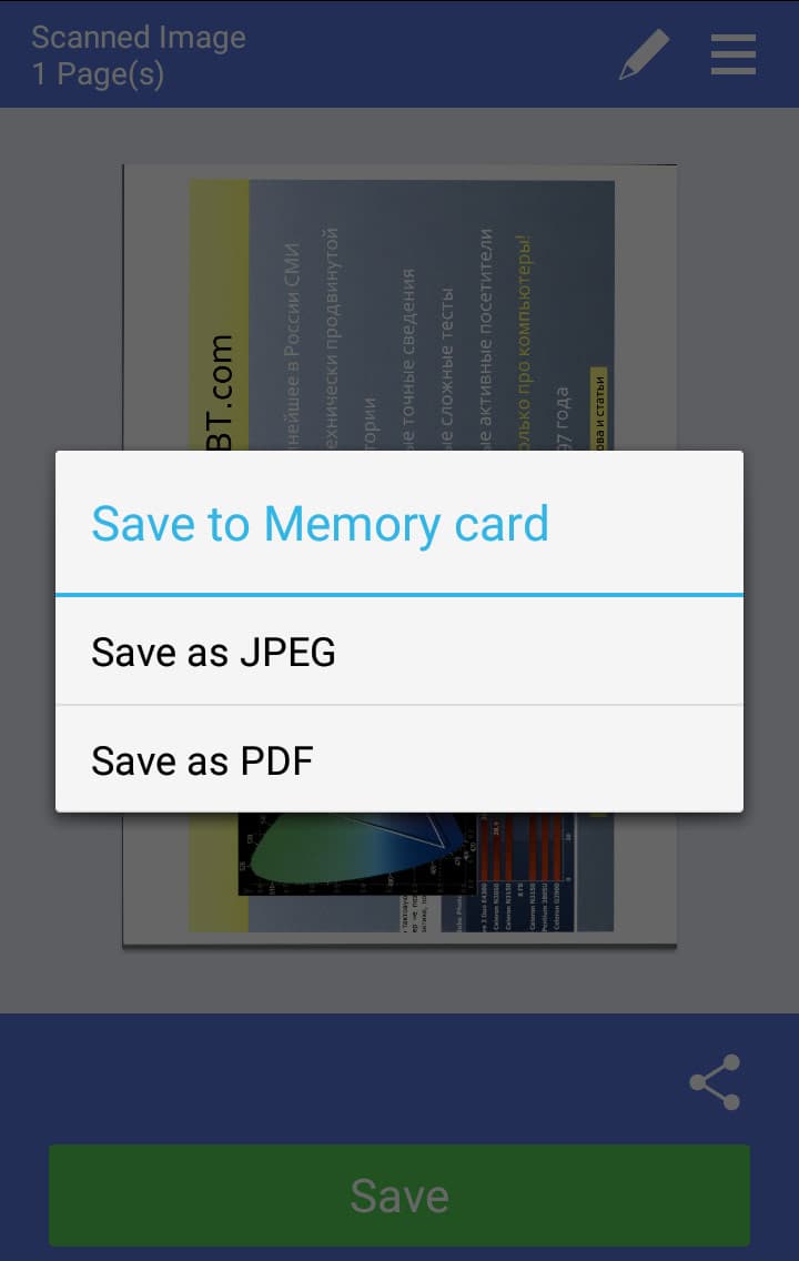 Значок в виде уголка над кнопкой Save позволяет «поделиться» (share) сканами в формате JPEG или PDF с каким-то из имеющихся на гаджете приложений — например, открыть для последующей обработки.