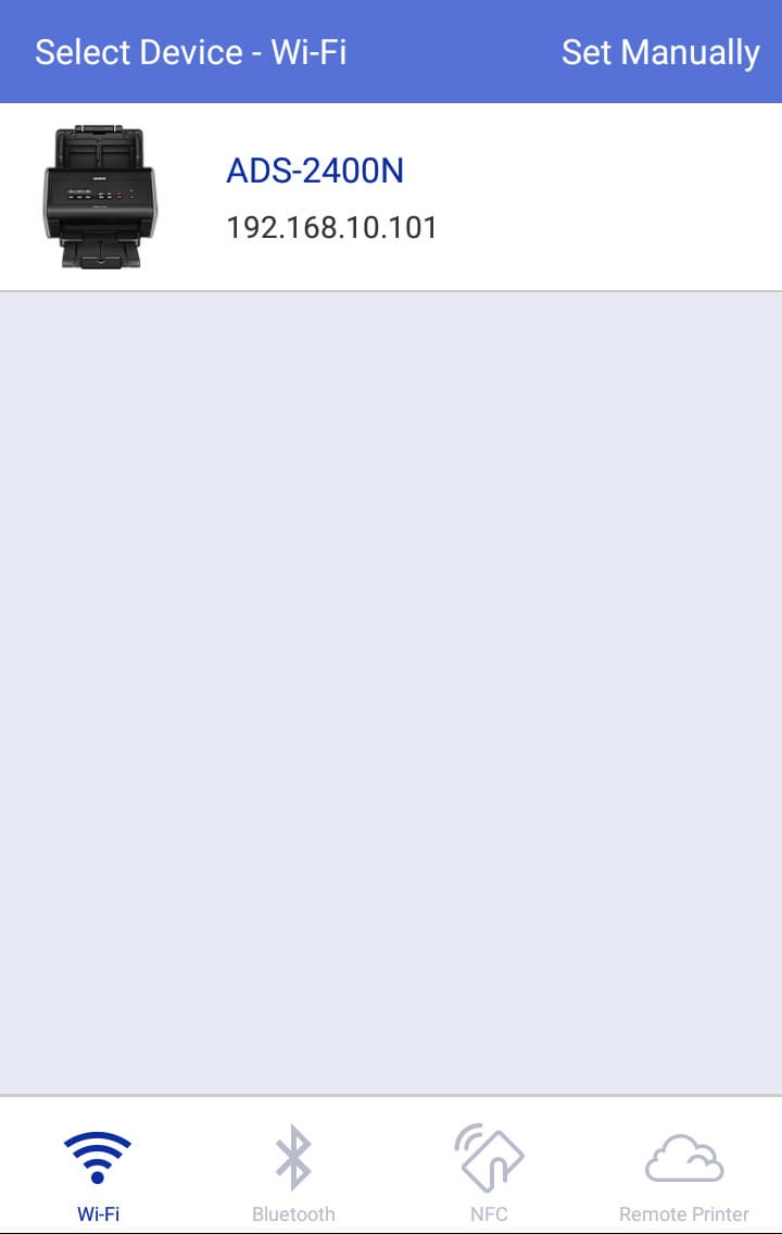 При первом запуске предлагается поиск устройств — естественно, гаджет должен быть подключен по Wi-Fi к тому же сегменту сети, что и сканер.