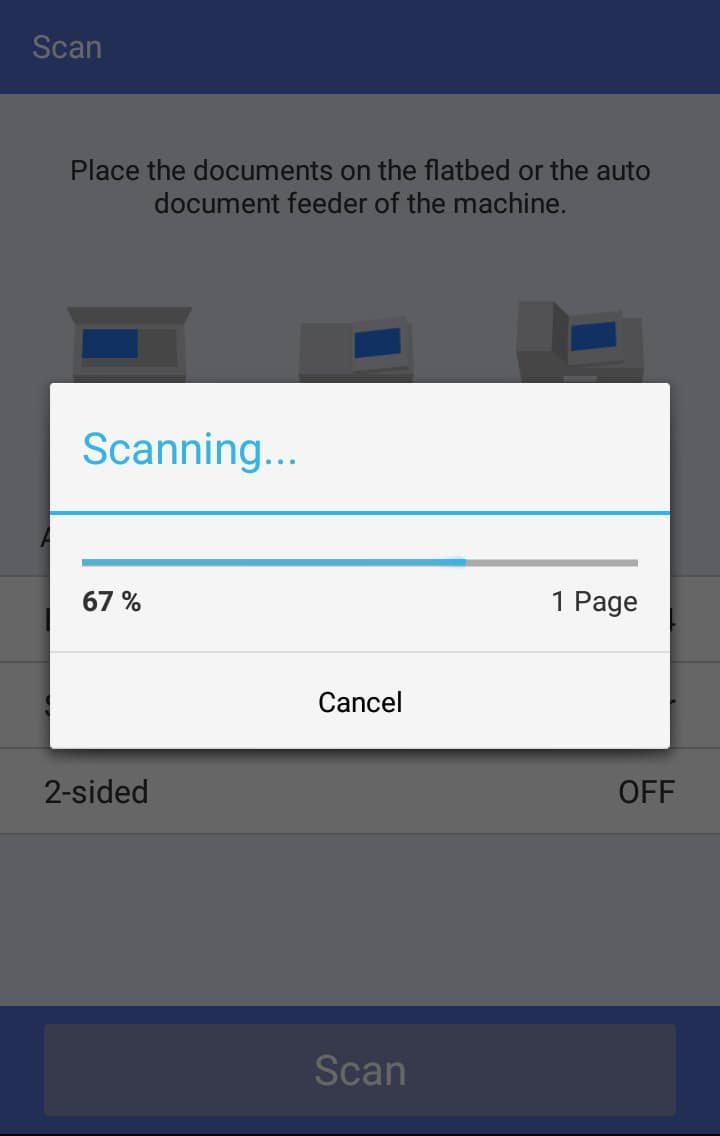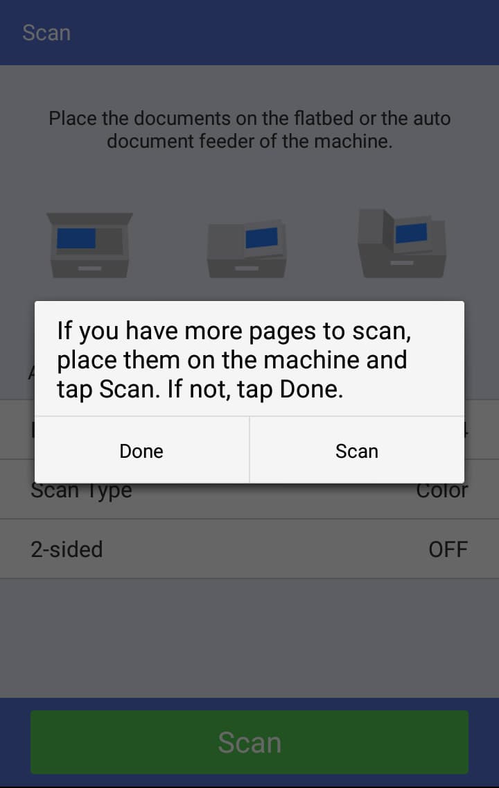 Жмем экранную кнопку Scan и ожидаем окончания процесса, в конце которого появляется запрос о дальнейших действиях: отсканировать еще набор документов или завершить текущий сеанс.