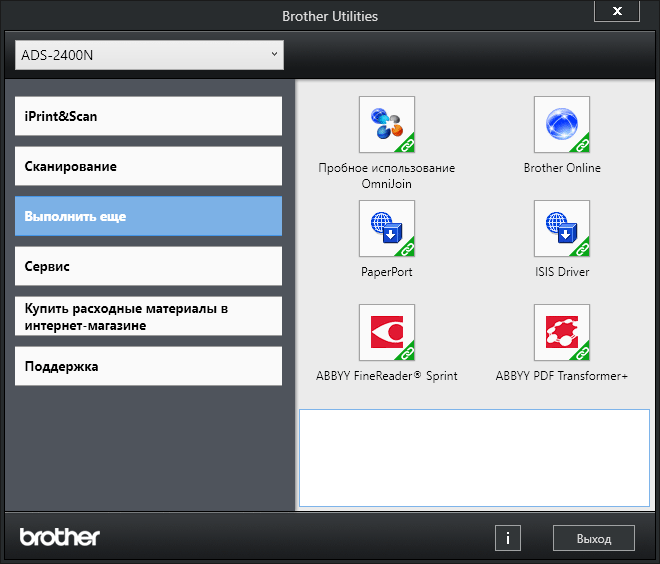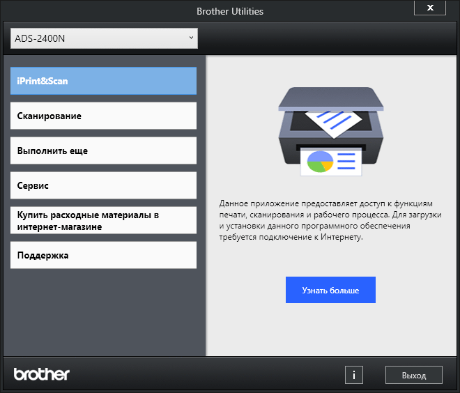 Выбираем нужное (если устройств Brother в сети несколько), далее открывается рабочее окно приложения с уточнением, что именно можно будет делать — в нашем случае сканировать и проверять состояние.