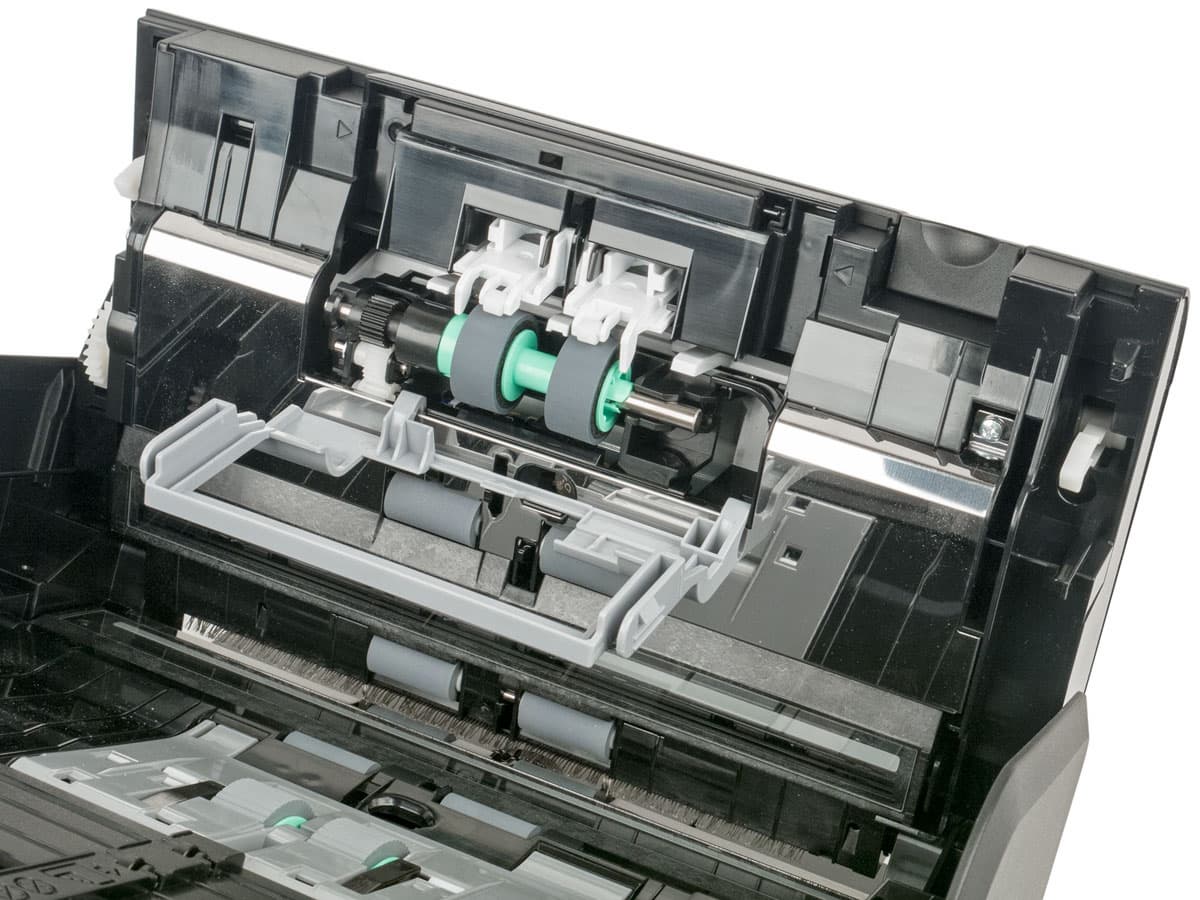 Всё это нужно для периодического обслуживания: после прохождения через сканер многих тысяч документов внутри неизбежно будет накапливаться бумажная пыль, ухудшающая качество сканирования, да и поверхности роликов будут загрязняться, что может вызвать сбои в подаче. Производитель рекомендует проводить очистку внутренних поверхностей после каждых 5000 сканирований.