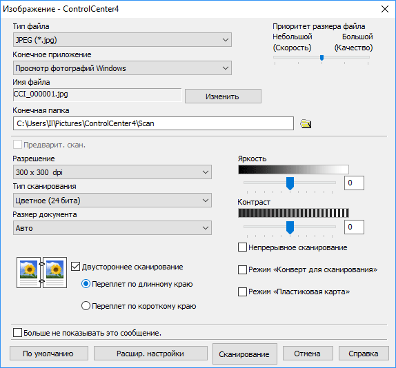 Клик по любой из иконок выводит окно с настройками, похожее на уже виденное нами. Отличия в более широком списке установок и в наличии кнопки запуска сканирования. Смысл режима в том, что окно ControlCenter уже не используется как промежуточный этап, сканы сразу будут передаваться в нужное приложение или сохраняться в папку.