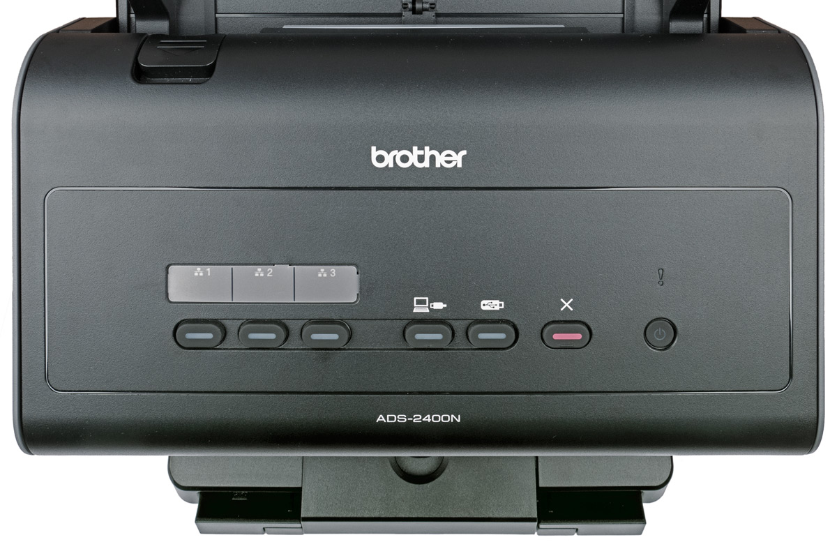 Brother ADS-2400N управляется с помощью всего семи кнопок, а состояние отображается таким же количеством светодиодных индикаторов, бо́льшая часть из которых встроена в кнопки.