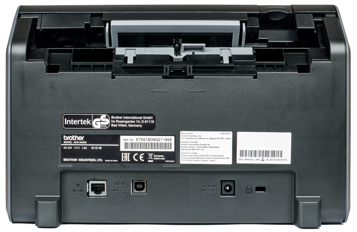 Сзади внизу расположены разъемы — питания, LAN и USB type B (female) для локального подключения к компьютеру. Все они находятся «в тени» подающего лотка, а потому подключенные коннекторы и кабели не будут увеличивать площадь, занимаемую сканером.