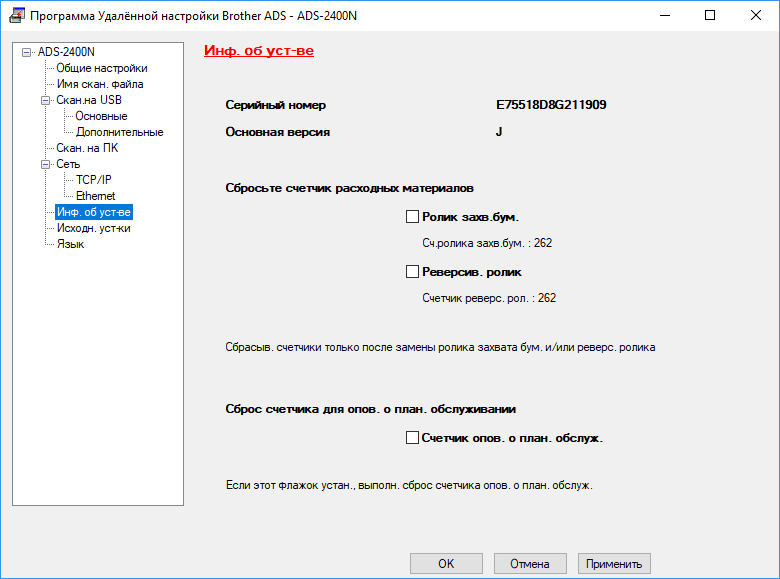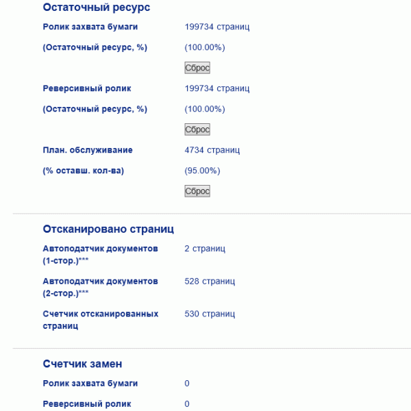 Здесь же можно посмотреть состояние счетчиков расходных материалов — роликов захвата бумаги и реверсивного ролика, а после замены сбросить эти значения. Предусмотрено оповещение о плановом обслуживании, также с возможностью сброса соответствующего счетчика после проведения работ.
