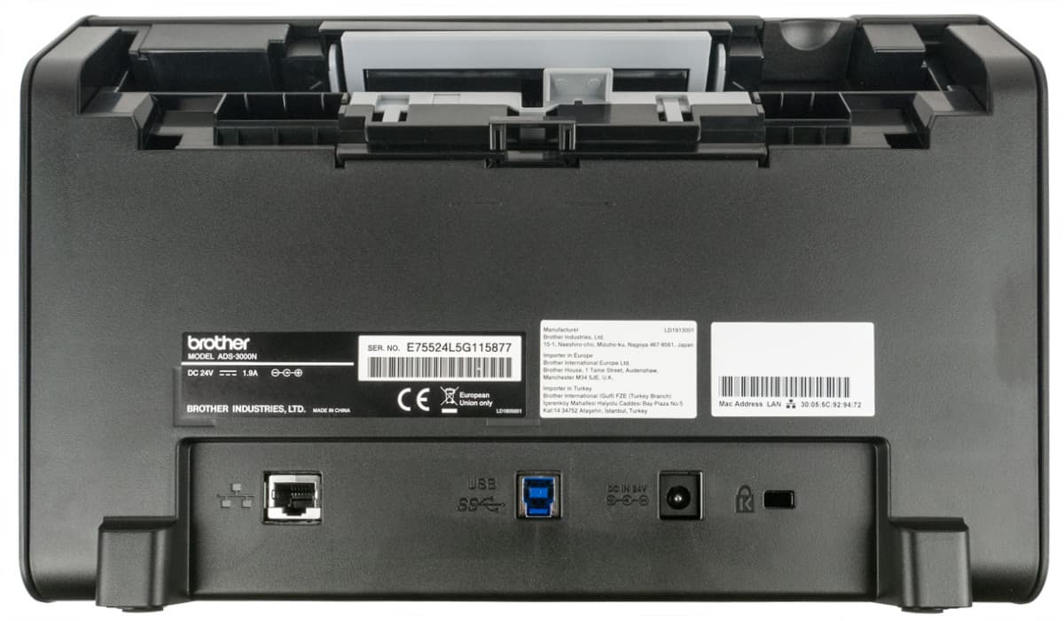 Сзади внизу расположены разъемы — питания, LAN и USB 3.0 для локального подключения к компьютеру. Все они находятся «в тени» подающего лотка, а потому подключенные коннекторы и кабели не будут увеличивать площадь, занимаемую сканером.