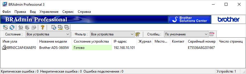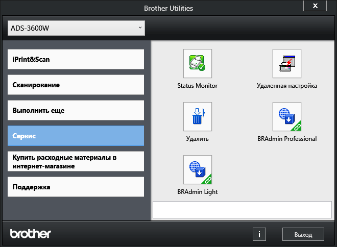 Выбираем нужный (если устройств Brother в сети несколько), далее следует уточнение, что именно можно будет делать — в нашем случае сканировать и проверять состояние. Открывается рабочее окно приложения.