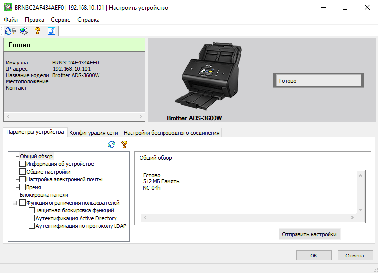 Во время настройки сканером пользоваться будет нельзя: на ЖК-экране ADS-3600W при запущенной утилите удаленной настройки отображаются песочные часы и надпись «Подождите...», но для локального подключения это не так уж критично.