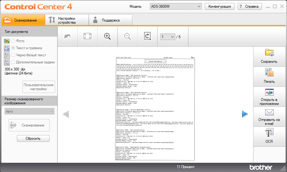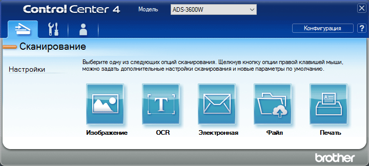 Из окна Brother Utilities можно задействовать приложение ControlCenter4, которое может запускаться по требованию или, как Status Monitor, включаться в автозагрузку. Оно позволит работать с документами без какого-либо дополнительного ПО, а также осуществлять настройки сканера через вызов только что упомянутой программы Brother ADS.