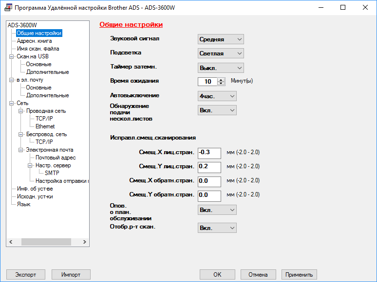 Многое из имеющегося в нём (возможно — всё, мы не сравнивали по пунктам) в модели ADS-3600W можно настраивать и с помощью сенсорного экрана, но на компьютере это делать удобнее. Ну, а для не имеющего продвинутой панели управления сканера ADS-3000N настройки и вовсе можно делать только через компьютер. Если сканеров несколько, то установки можно сделать для одного из них, затем экспортировать в файл и импортировать его для остальных.