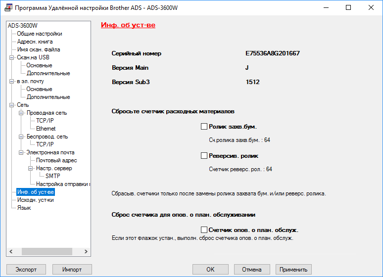 Здесь же можно посмотреть состояние счетчиков расходных материалов — роликов захвата бумаги и реверсивного ролика, а после замены сбросить эти значения. Предусмотрено оповещение о плановом обслуживании, также с возможностью сброса соответствующего счетчика после проведения работ.
