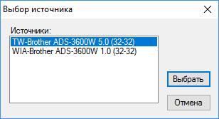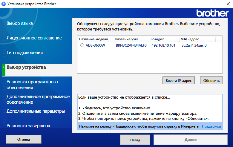 На этапе выбора устройства осуществляется поиск в сети с выдачей списка найденных сканеров Brother, выбираем нужный.