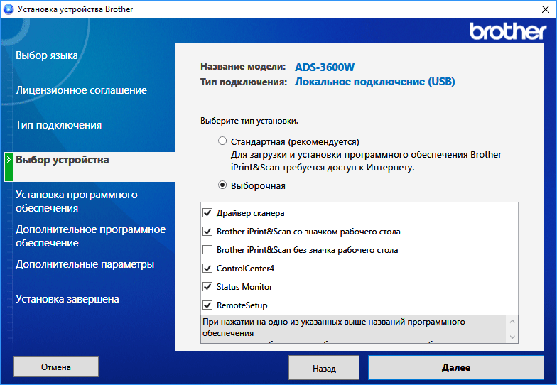 Затем следует запрос состава устанавливаемого ПО — пока речь идет о драйверах, а также служебных программах и утилитах от Brother.