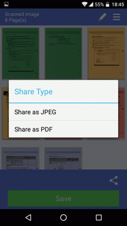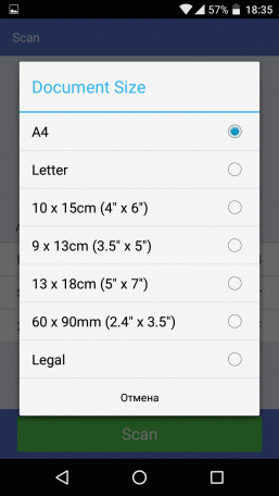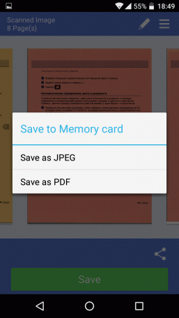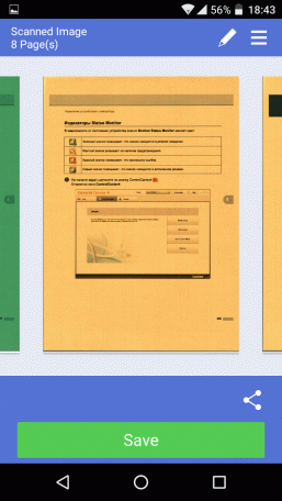 Значок в виде уголка над кнопкой Save позволяет «поделиться» (share) сканами в формате JPEG или PDF с каким-то из имеющихся на гаджете приложений — например, открыть для последующей обработки.