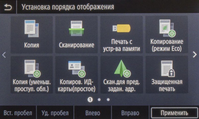 Содержание заглавных страниц можно менять для упрощения доступа к часто используемым функциям. При этом одной из особенностей меню в моделях серии является использование библиотеки приложений (Application Library) — средства для формирования ряда экранных кнопок, позволяющих одним касанием выполнять определенные операции из числа часто используемых. Среди них могут быть как очень полезные — распечатка заранее зарегистрированных документов (например, каких-то часто используемых бланков) или сканирование с отправкой конкретному адресату, так и чисто «украшательские» вроде задания последовательности слайдов для отображения на экране в качестве заставки. Причем определять выводимый на экран набор этих кнопок и параметры для задаваемых ими действий может сам пользователь в соответствии со своими потребностями.