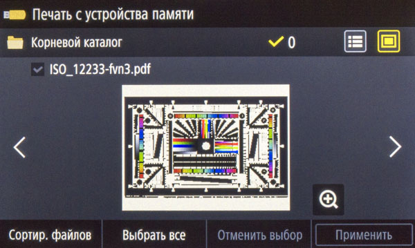 После выбора «Печать с устр-ва памяти» на ЖК-экране появляется страница с содержимым носителя — файлами и папками (длинные имена и кириллица отображаются нормально). Двумя кнопками в ее верхнем правом углу можно выбирать тип отображения: либо аналог «проводника» Windows, либо в виде слайдера с функцией просмотра.
