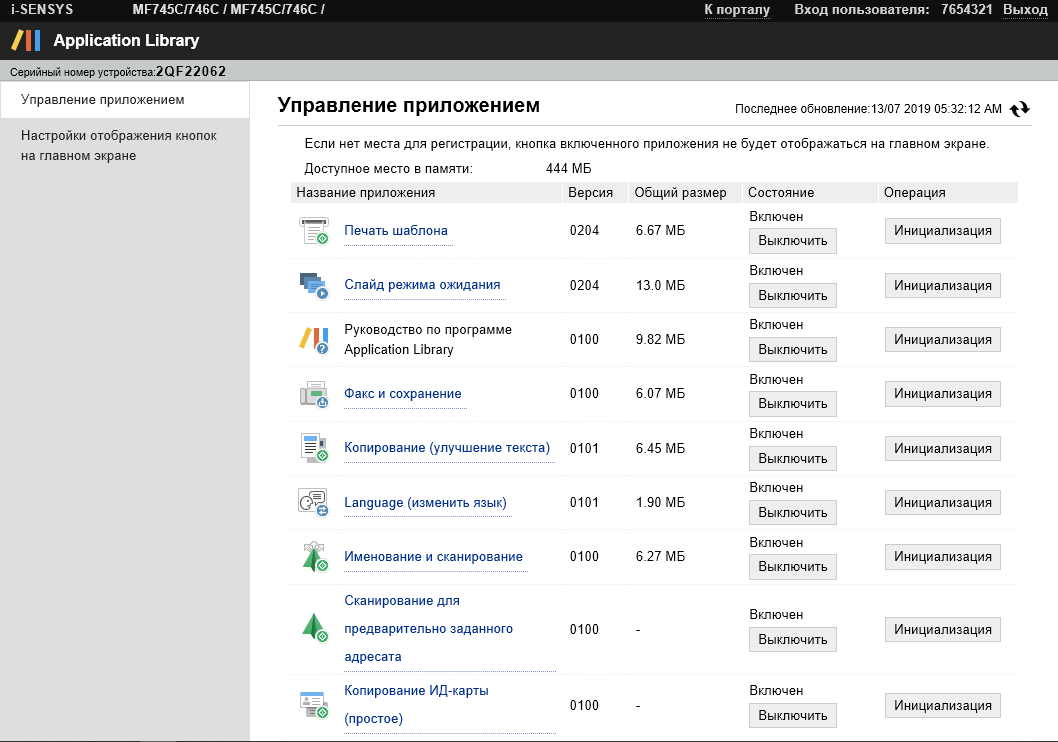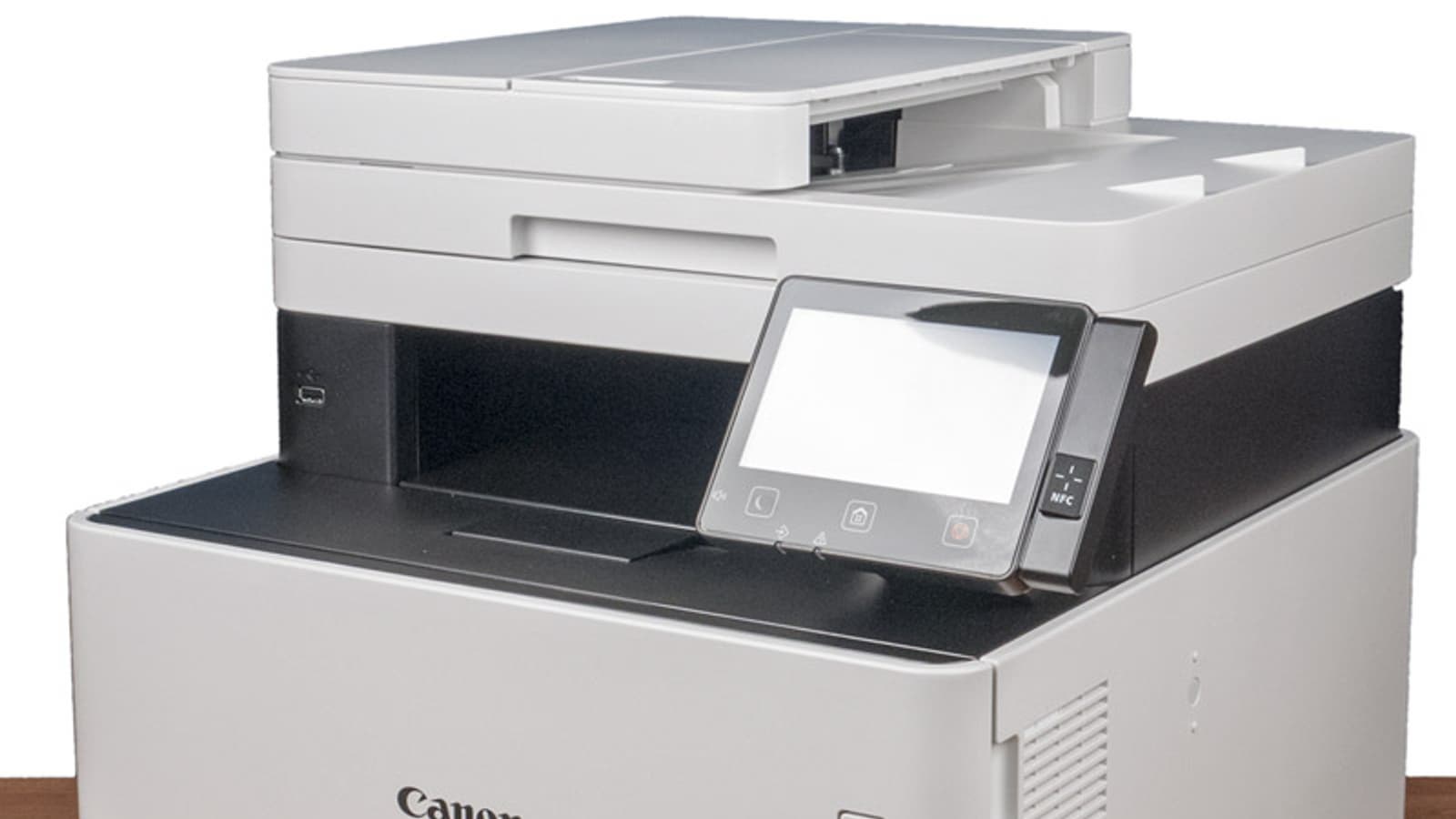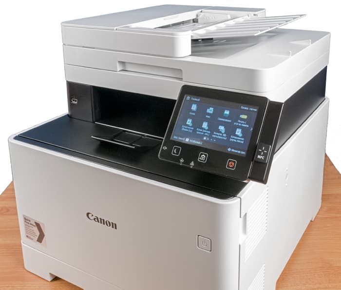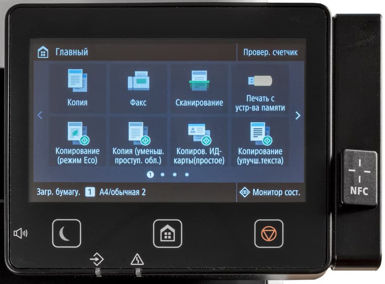 На панели управления, помимо ЖК-экрана, всего три кнопки: управления режимом энергосбережения, возврата к «домашней» странице меню и стоп/отмена, все сенсорные. Под ними два светодиодных индикатора — данных и ошибки. На левом торце имеется небольшая кнопка управления громкостью для факса, а справа находится дополнительная панелька с меткой NFC (ее нет в младшей модели MF742Cdw «3 в 1»).