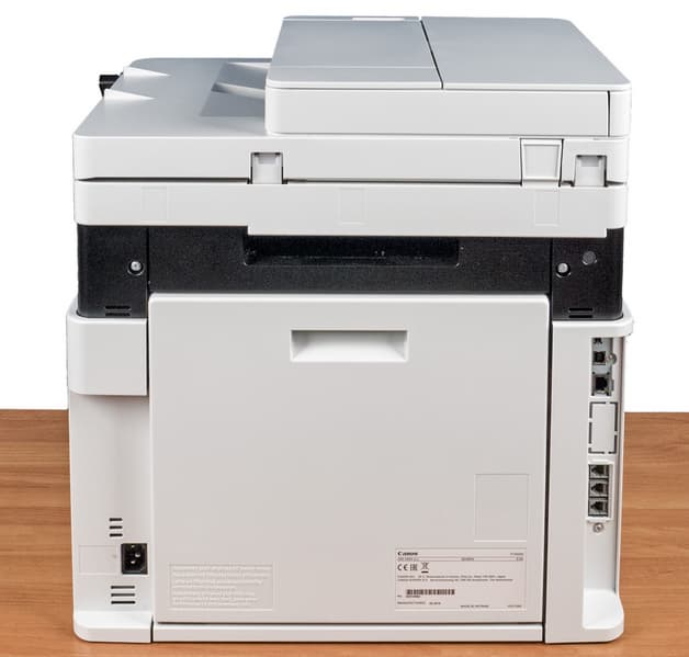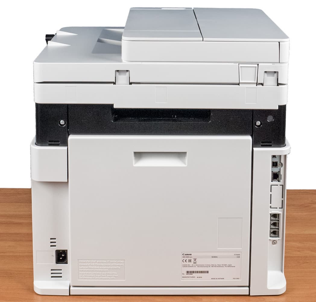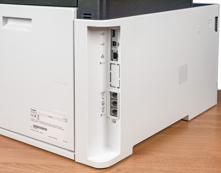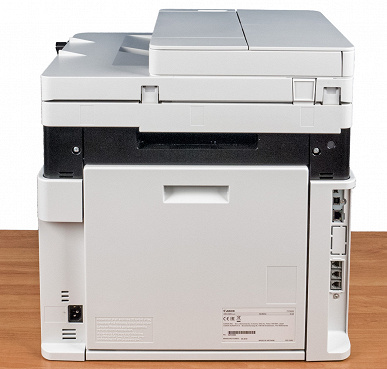 Почти всю площадь задней стенки занимает откидная крышка тракта подачи бумаги, вокруг нее — различные разъемы.