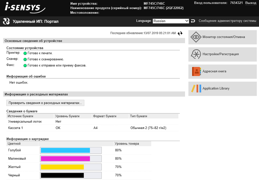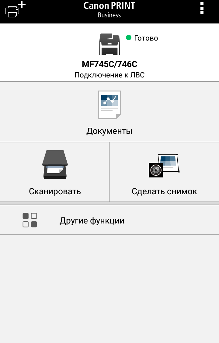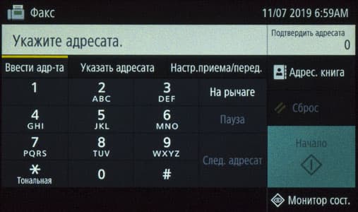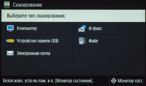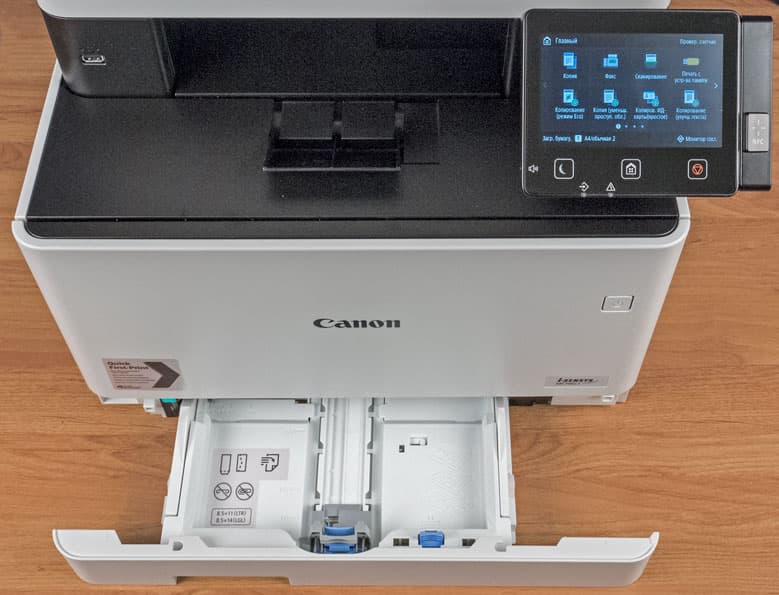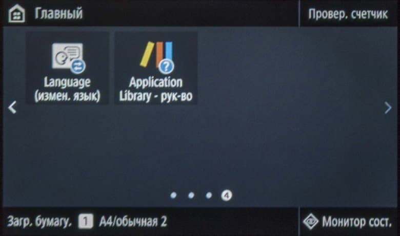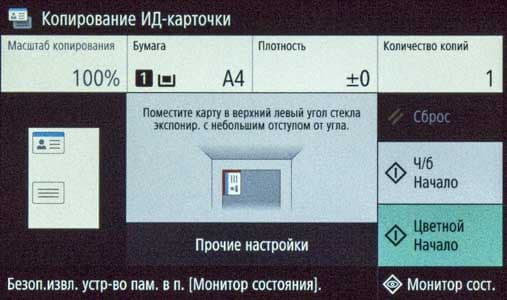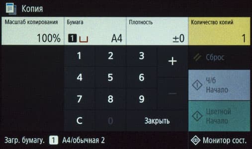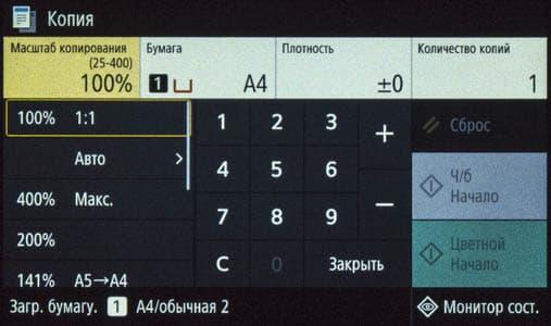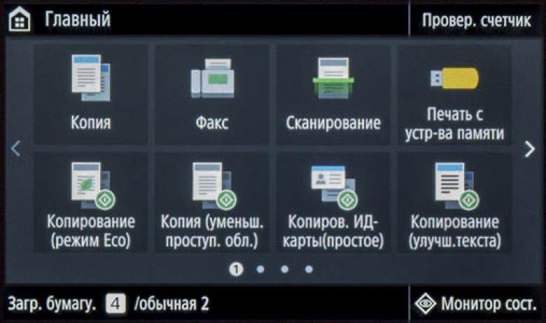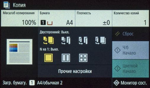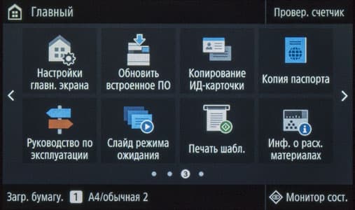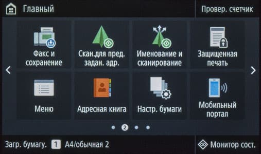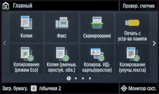 Наконец, на экране появляется домашняя страница меню, хорошо знакомая нам по другим современным моделям МФУ Canon; все, можно работать.
