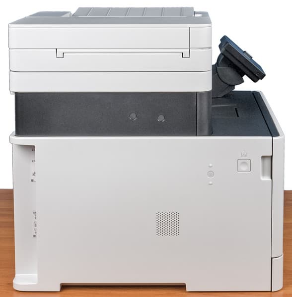 Компоновка аппарата самая обычная: внизу печатающий блок, вверху сканер, между ними выводной или приемный лоток вместимостью 150 листов (здесь и далее при 80 г/м², если не указано иное). Печатающий блок почти квадратный в горизонтальной проекции, по размерам он заметно больше сканера.