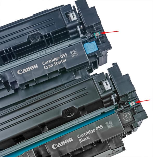 В картриджах имеются чипы (их контактные площадки на фото показаны стрелками), определяющие тип каждого из них.