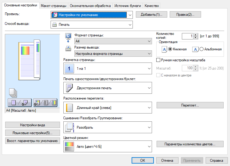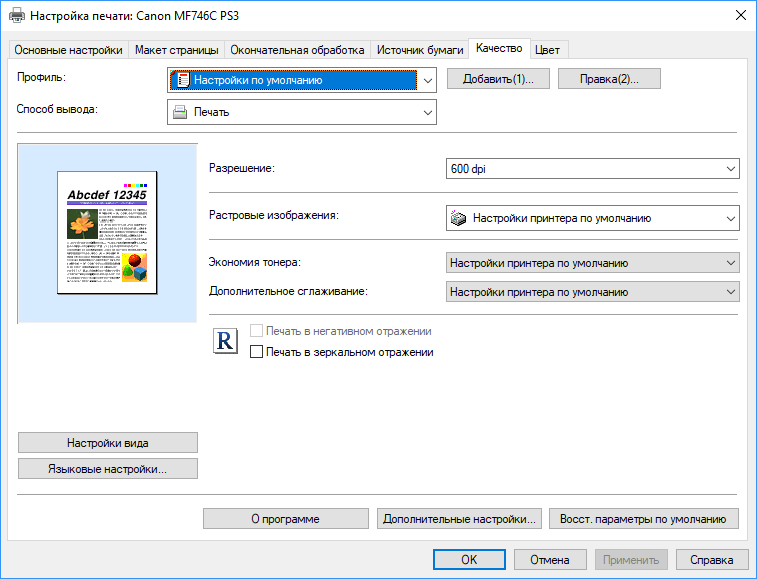 Поскольку выше отмечалось, что изменение разрешения (при прочих равных) на скорость практически не влияет, то если печать ведется с использованием шрифтов малых кеглей либо к качеству предъявляются повышенные требования, вполне можно рекомендовать сделать 1200 dpi установкой по умолчанию, хотя это значение и не является физическим разрешением печати.