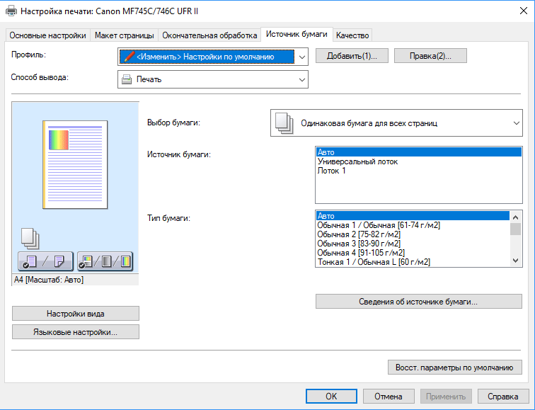 В драйвере на закладке «Источник бумаги» можно поставить «Авто», и тогда будет использован формат и тип носителя, заданный в меню МФУ. Однако в списке «Тип бумаги» драйвера для любого из лотков конвертов нет, есть только этикетки; чтобы конверты появились здесь, надо на закладке «Основные настройки» для формата страницы выбрать один из конвертов. Заодно появится и строчка «Открытка (127—190 г/м²)».