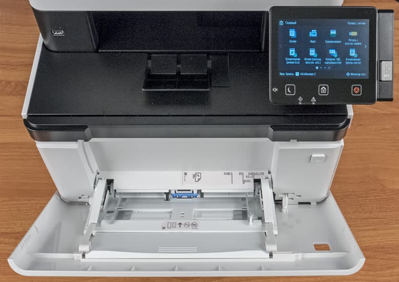 Универсальный лоток закреплен на еще одной откидной крышке, которая открывает доступ к внутренним частям принтера, включая выдвижной лоток для картриджей.