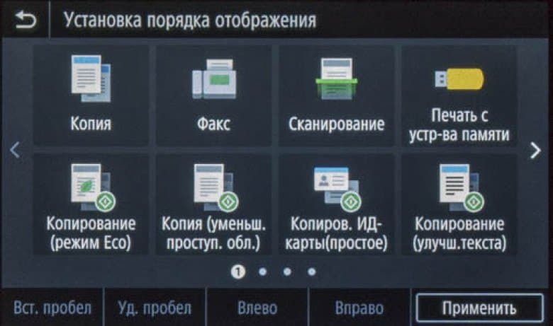 «Домашняя» страница экранного меню по умолчанию состоит из четырех частей с горизонтальной прокруткой. На них находятся иконки основных операций — копирования, сканирования, работы с факсимильными сообщениями и со сменными носителями, вызова меню настроек, экранной справки и прочее.