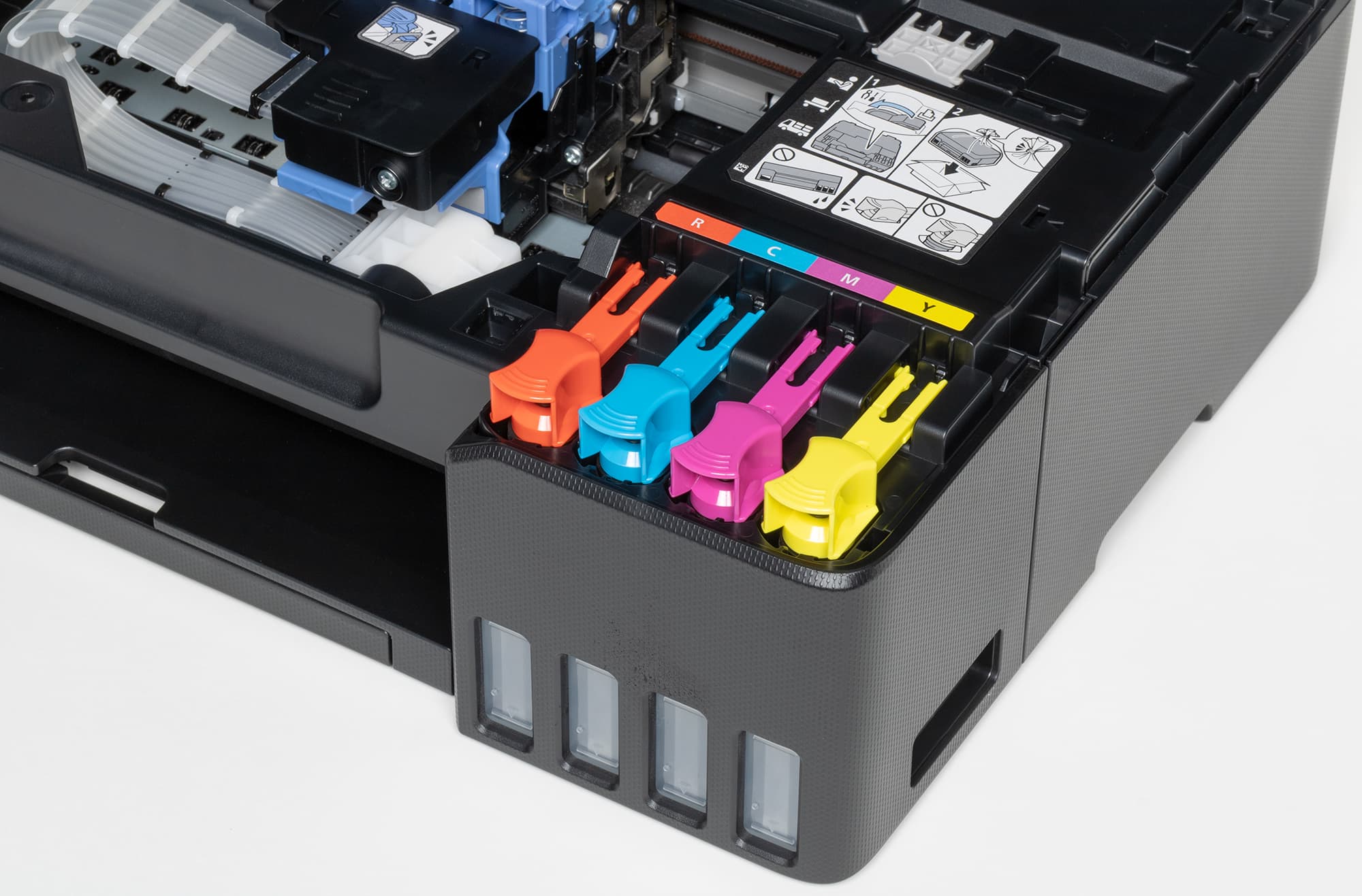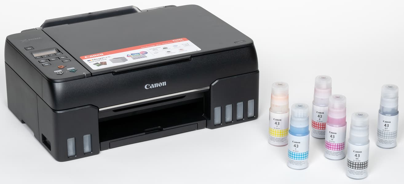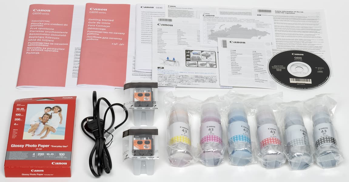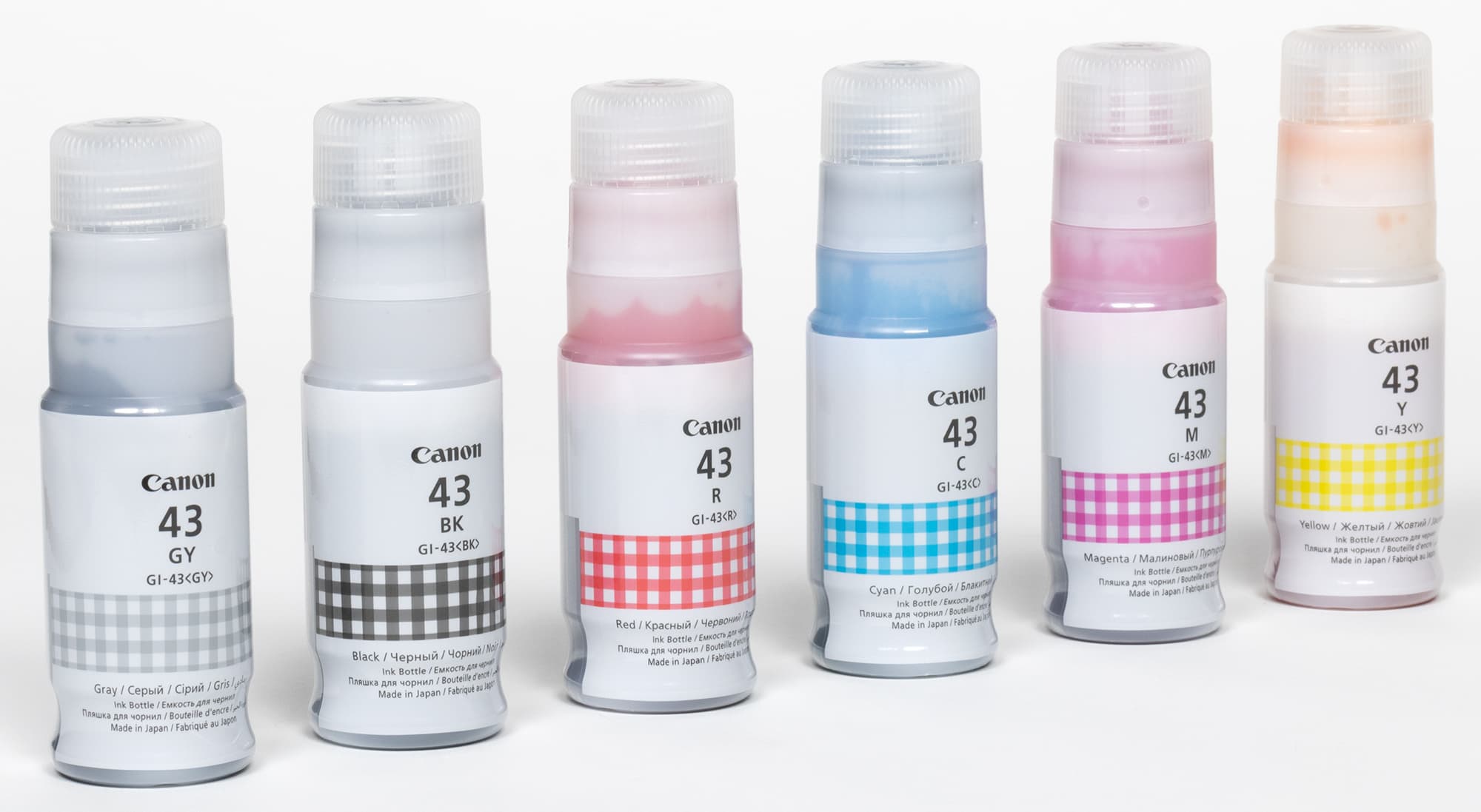 - шесть контейнеров (бутылочек) с чернилами: черными BK, серыми GY, голубыми C, пурпурными M, желтыми Y и красными R, по 60 мл — запас, способный обеспечить до 3,7/8 тысяч черно-белых/цветных отпечатков А4 (ISO/IEC 24712) или до 3,8 тысяч фотоотпечатков 10×15 см (ISO/IEC 29103),