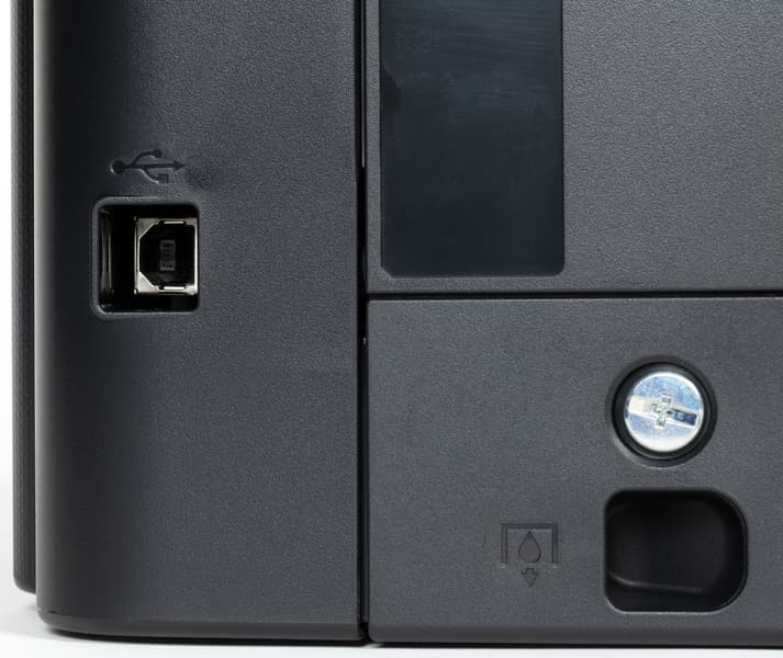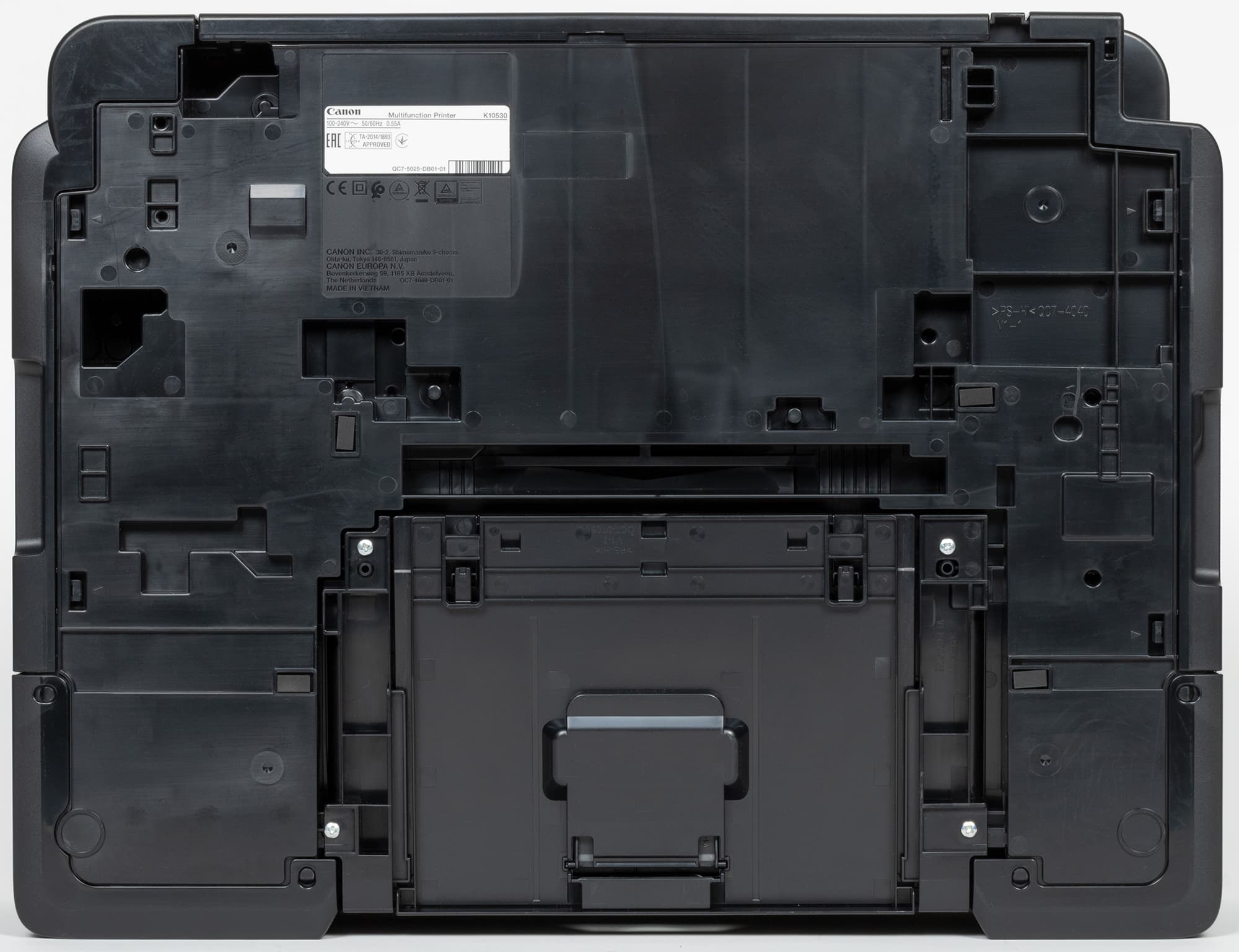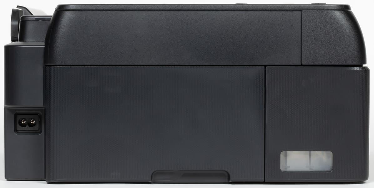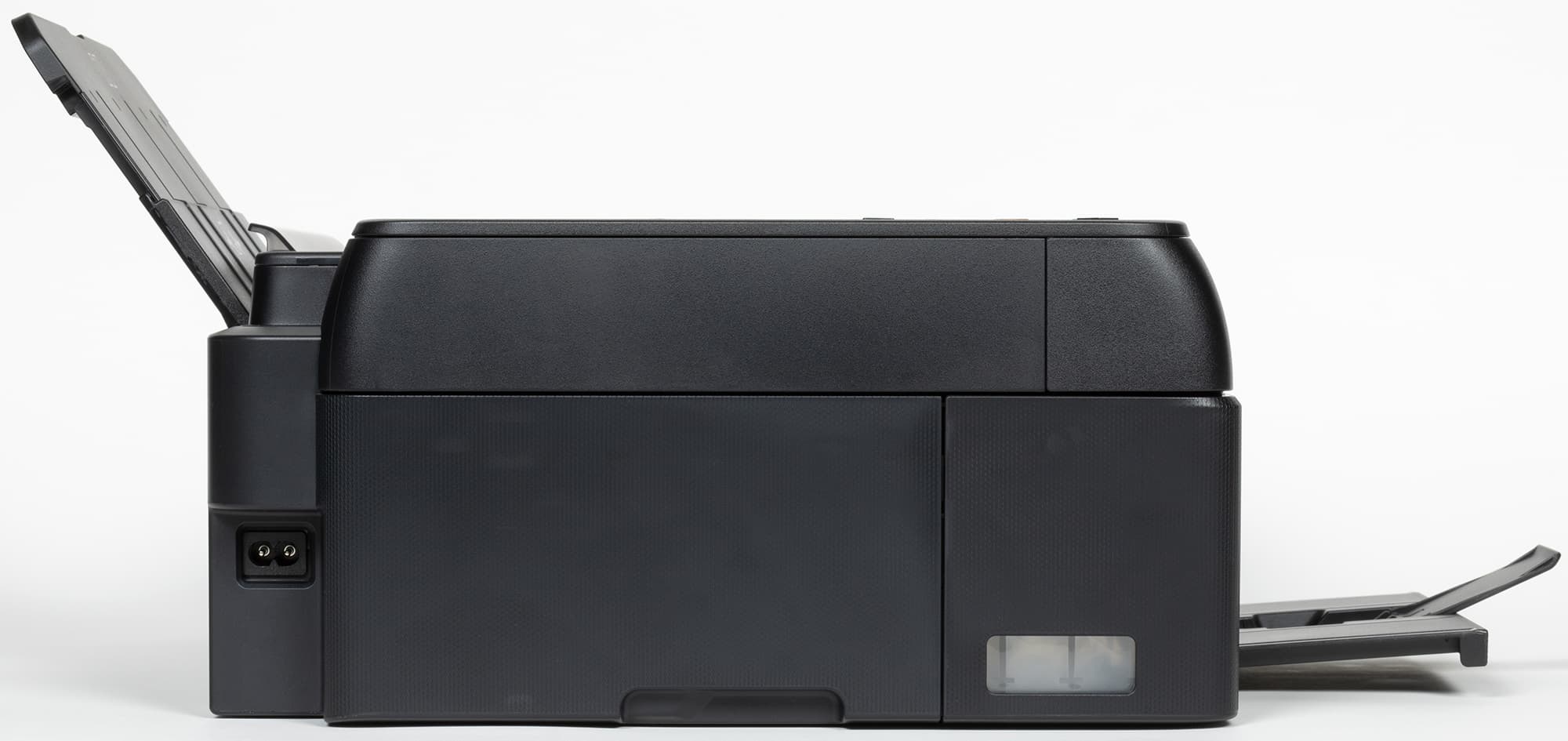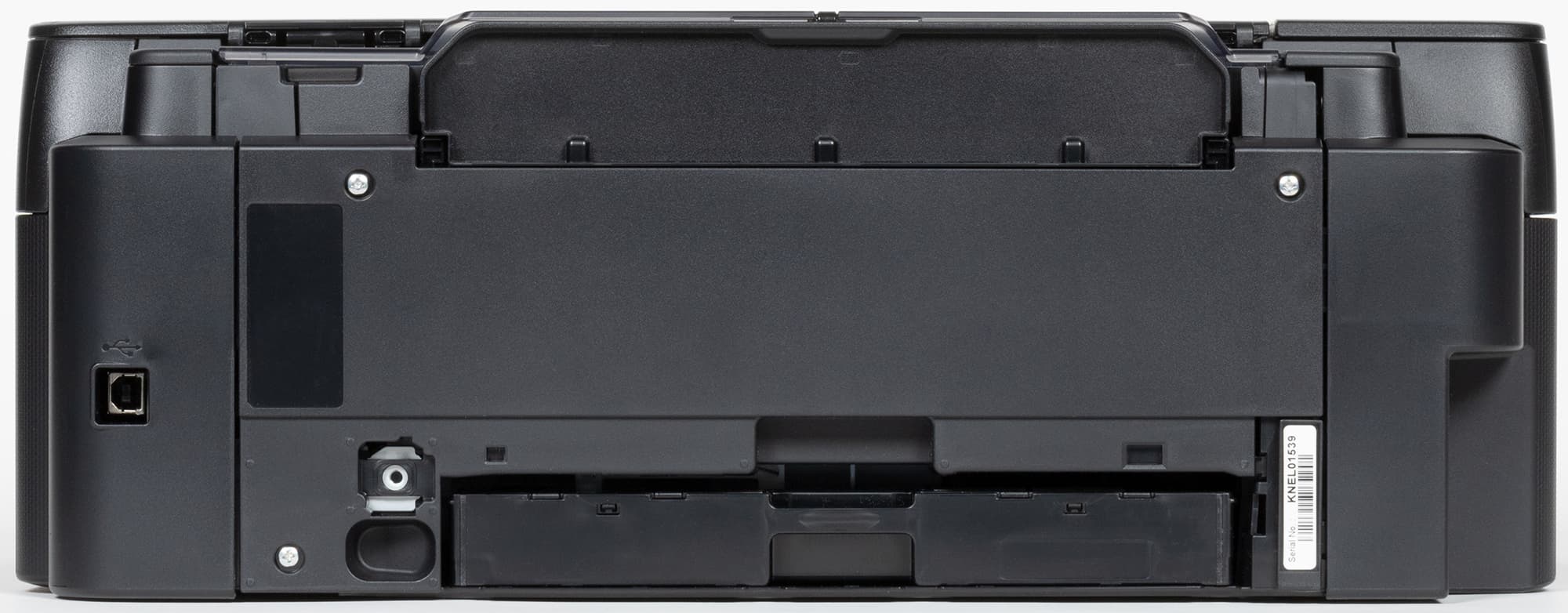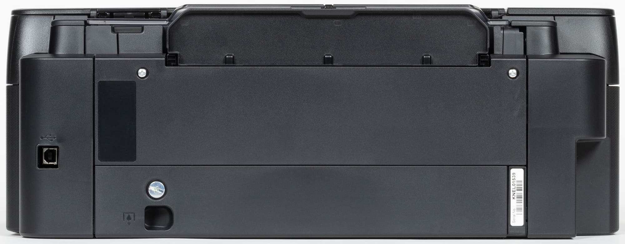 Гнездо питания расположено сзади сбоку, причем в небольшой нише, а потому вставляемый в него кабель лишь слегка выходит за габариты корпуса. Разъем USB-B для подключения к компьютеру выведен непосредственно на заднюю стенку, но дополнительного места позади МФУ для интерфейсного кабеля не потребуется: выдвинутому в рабочее положение подающему лотку нужно минимум 8-9 сантиметров.