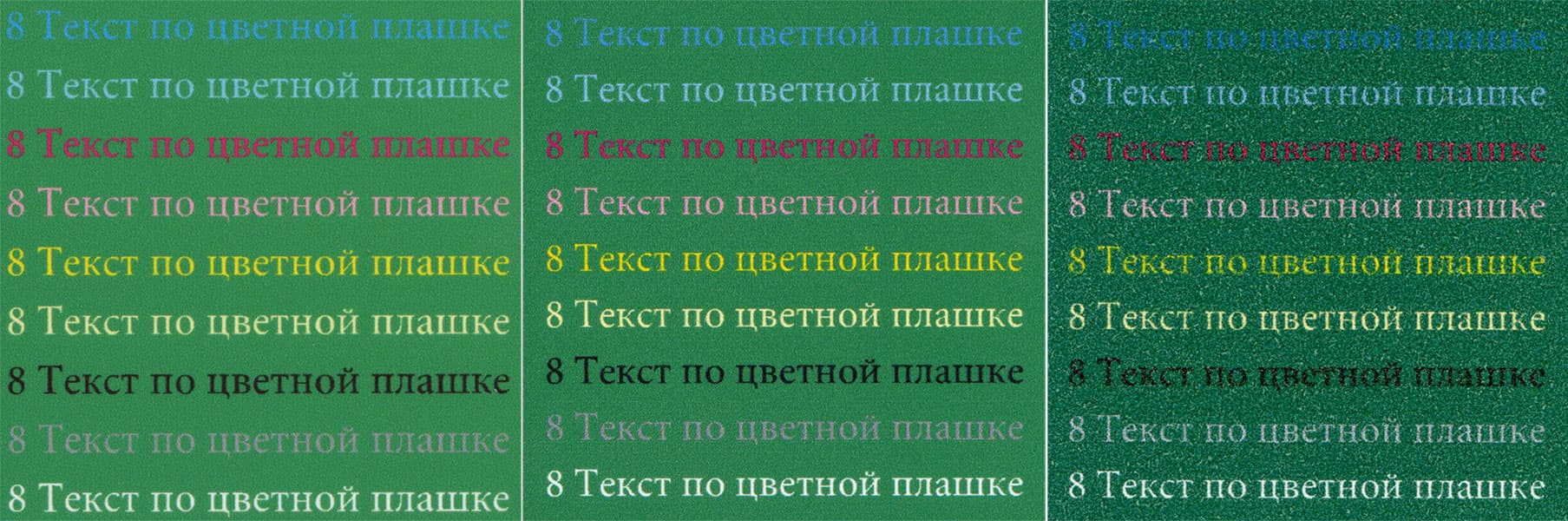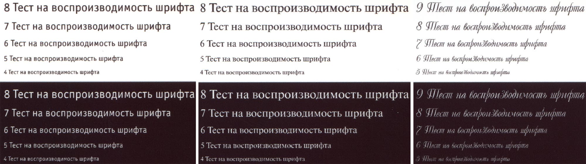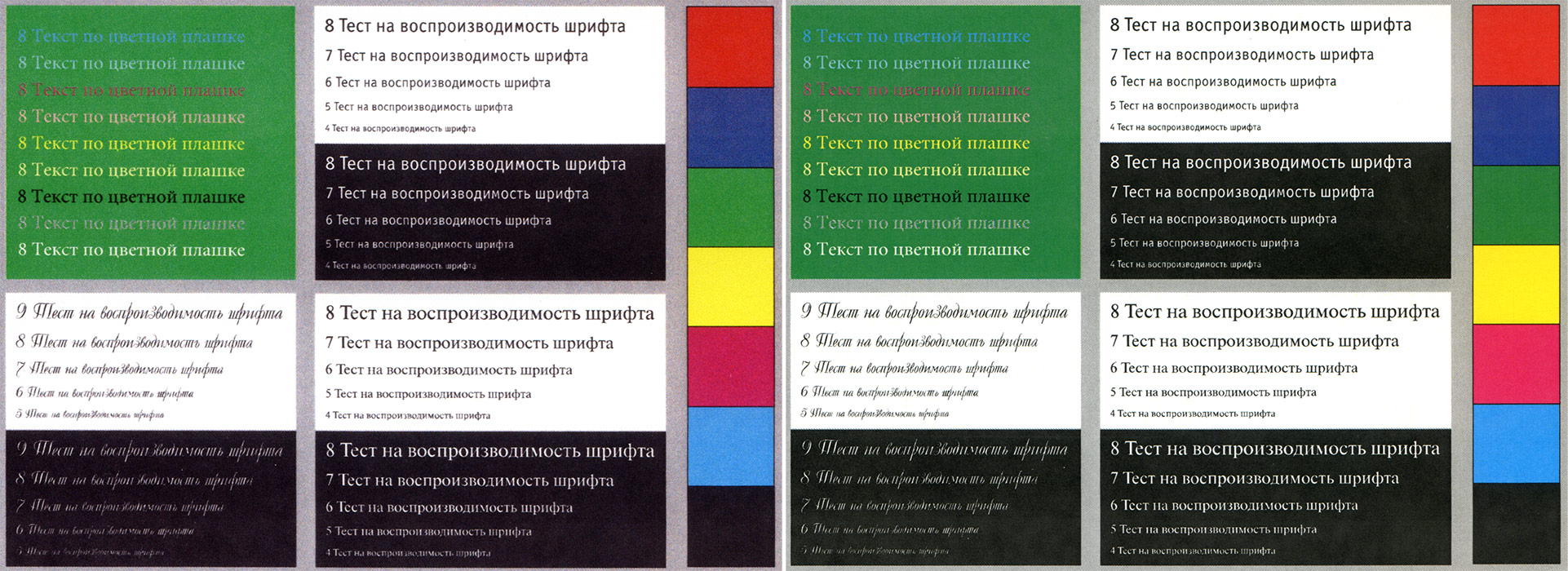 Текстовые поля воспроизводятся хорошо: при печати нормальной и вывороткой шрифты с засечками и без читаются от 4-го кегля. Декоративный шрифт реально читается с кеглем от 5-го нормальный и от 6-го вывороткой.