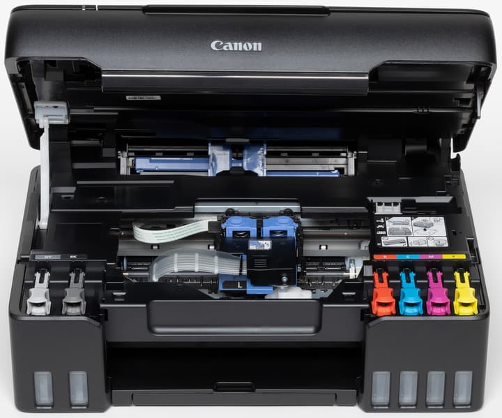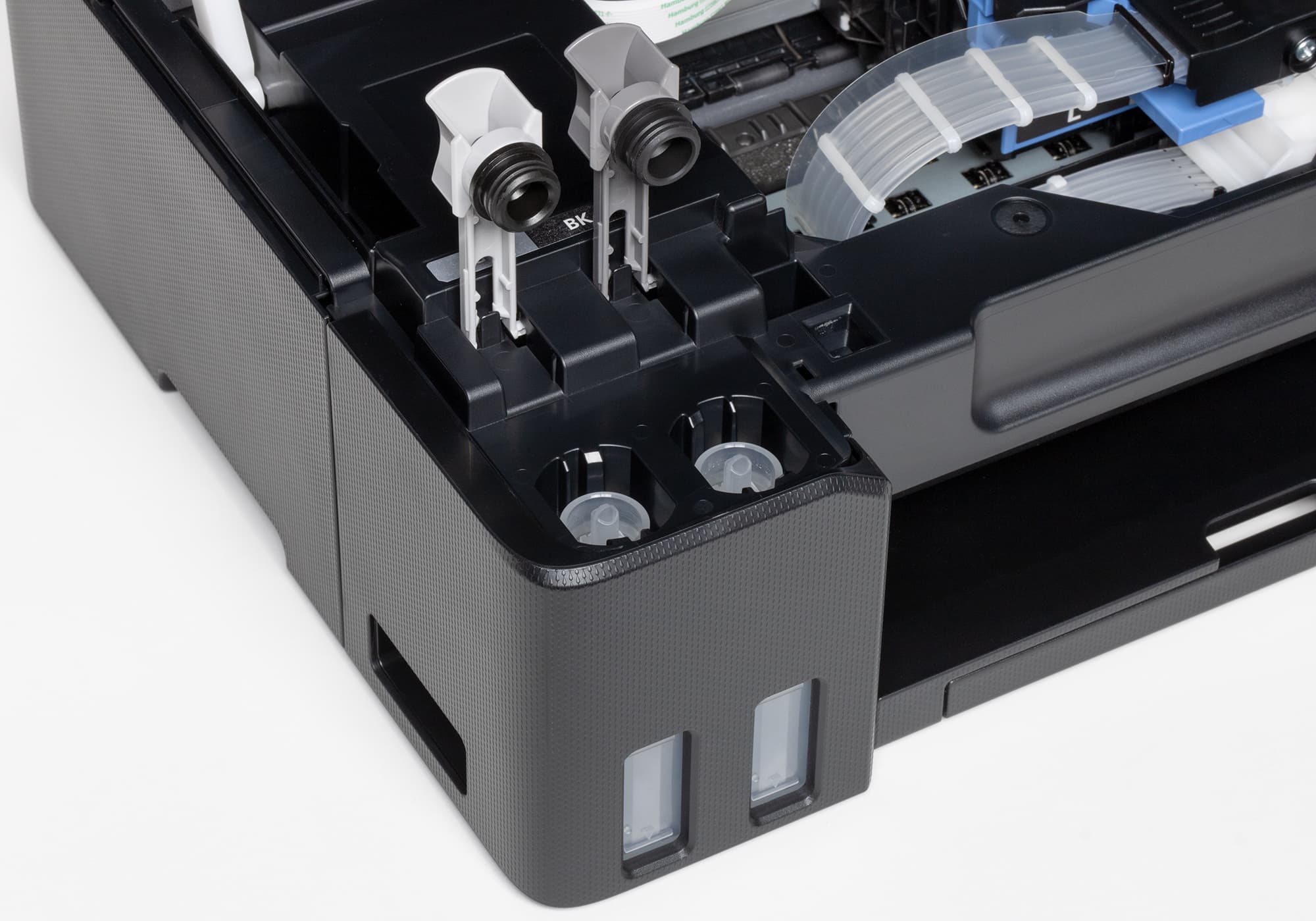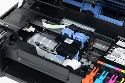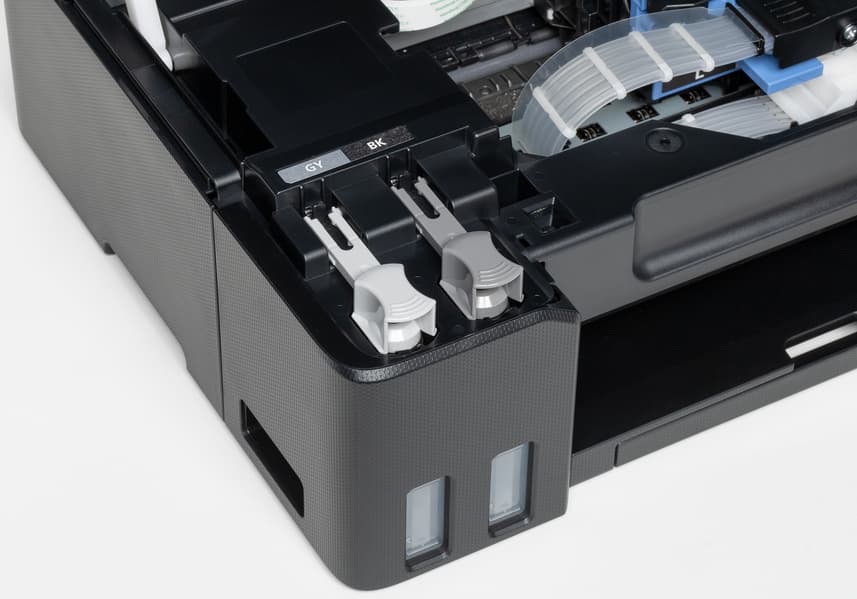 Верхняя часть МФУ откидывается вверх на угол около 40° с фиксацией в открытом состоянии, предоставляя доступ к узлам и механизмам принтера, а также к встроенным емкостям: слева находятся два контейнера для черных и серых чернил, а справа четыре для остальных цветов. Вместимость у всех одинаковая.