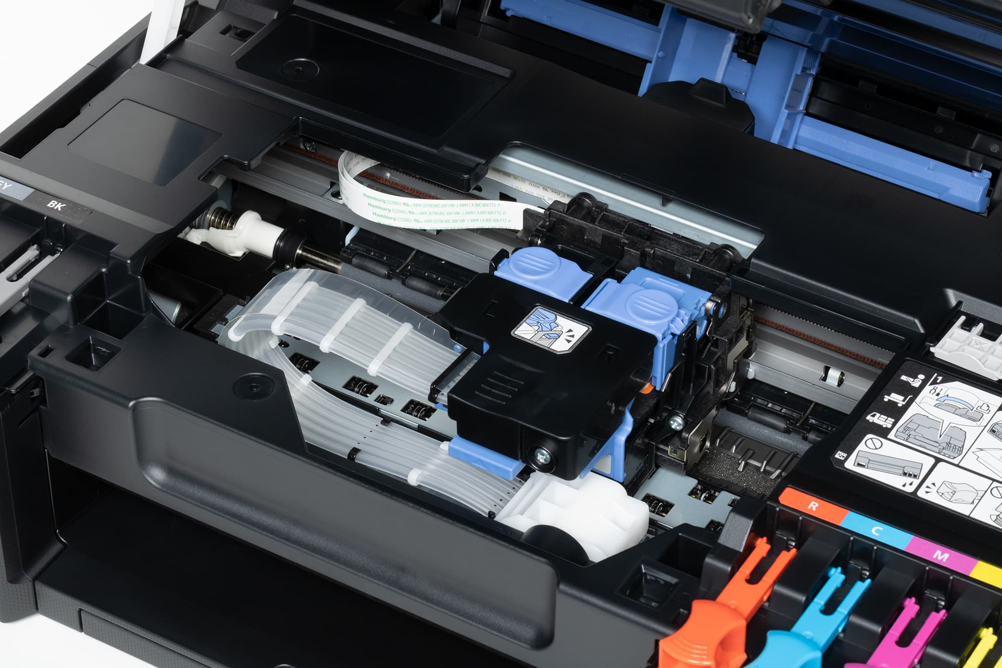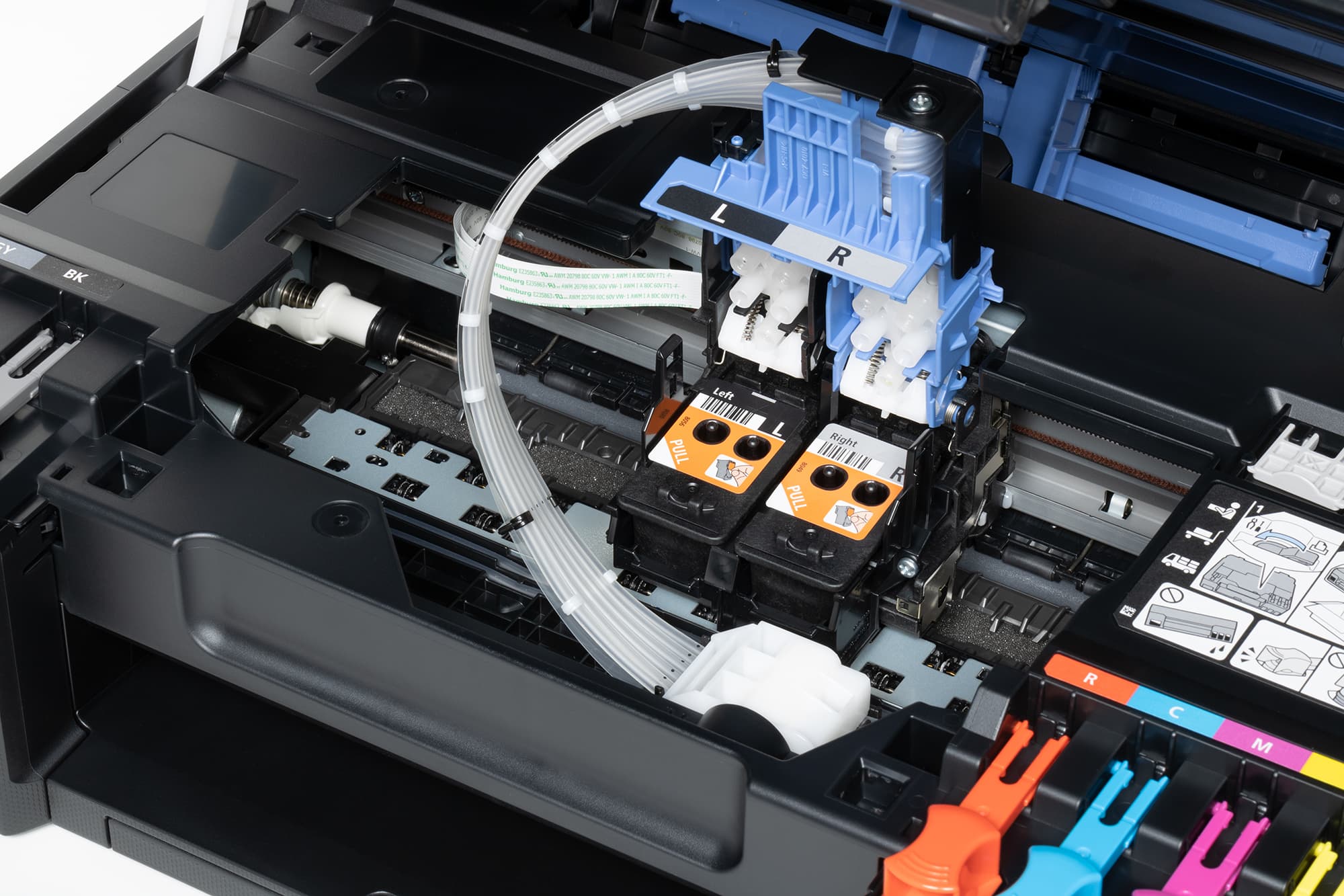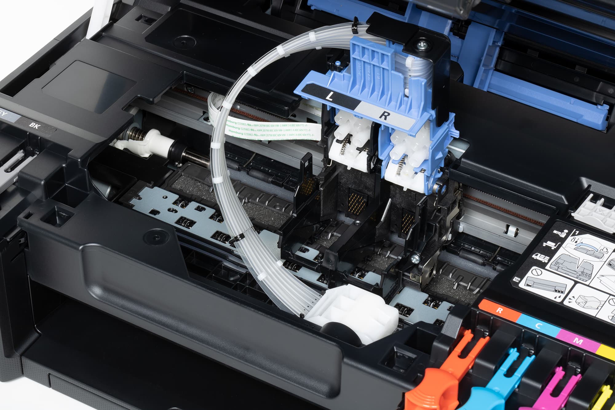 Немного глубже находится каретка с печатающими головками, чернила к ним подаются через аккуратно проложенные трубочки.