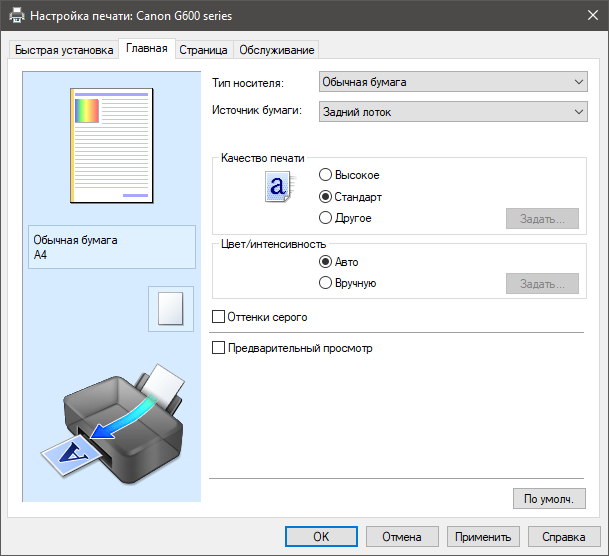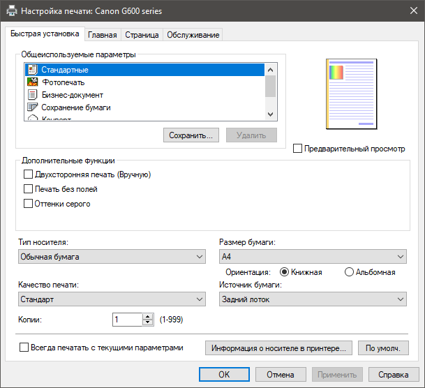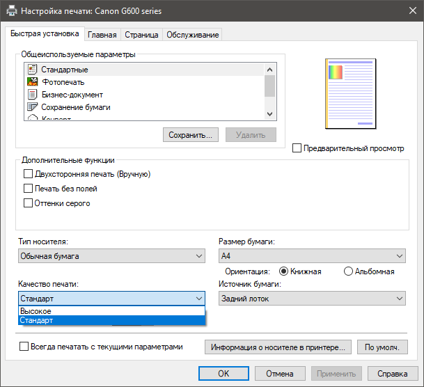 Но с высоким качеством печать занимает существенно больше времени, и такую установку можно рекомендовать только для самых важных документов данного типа.